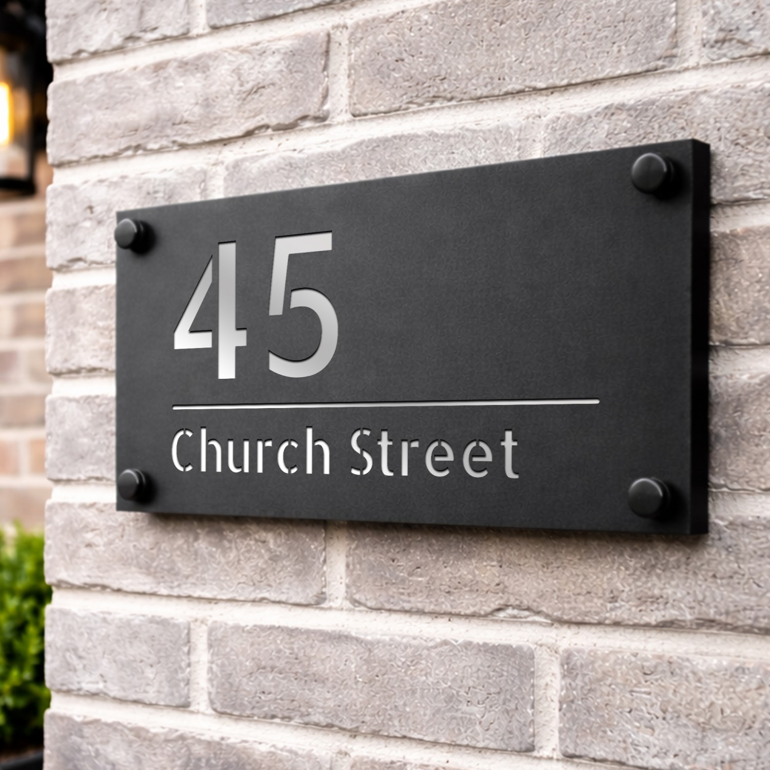 The laser cut 3D numbers and text ensure a crisp, professional finish, while the 4 matte black standoffs add a subtle yet sophisticated mounting detail. Designed for durability, this sign is weather-resistant, UV-protected, and built to withstand the British climate without fading or warping.