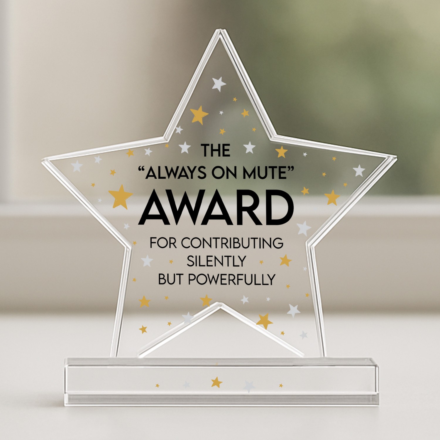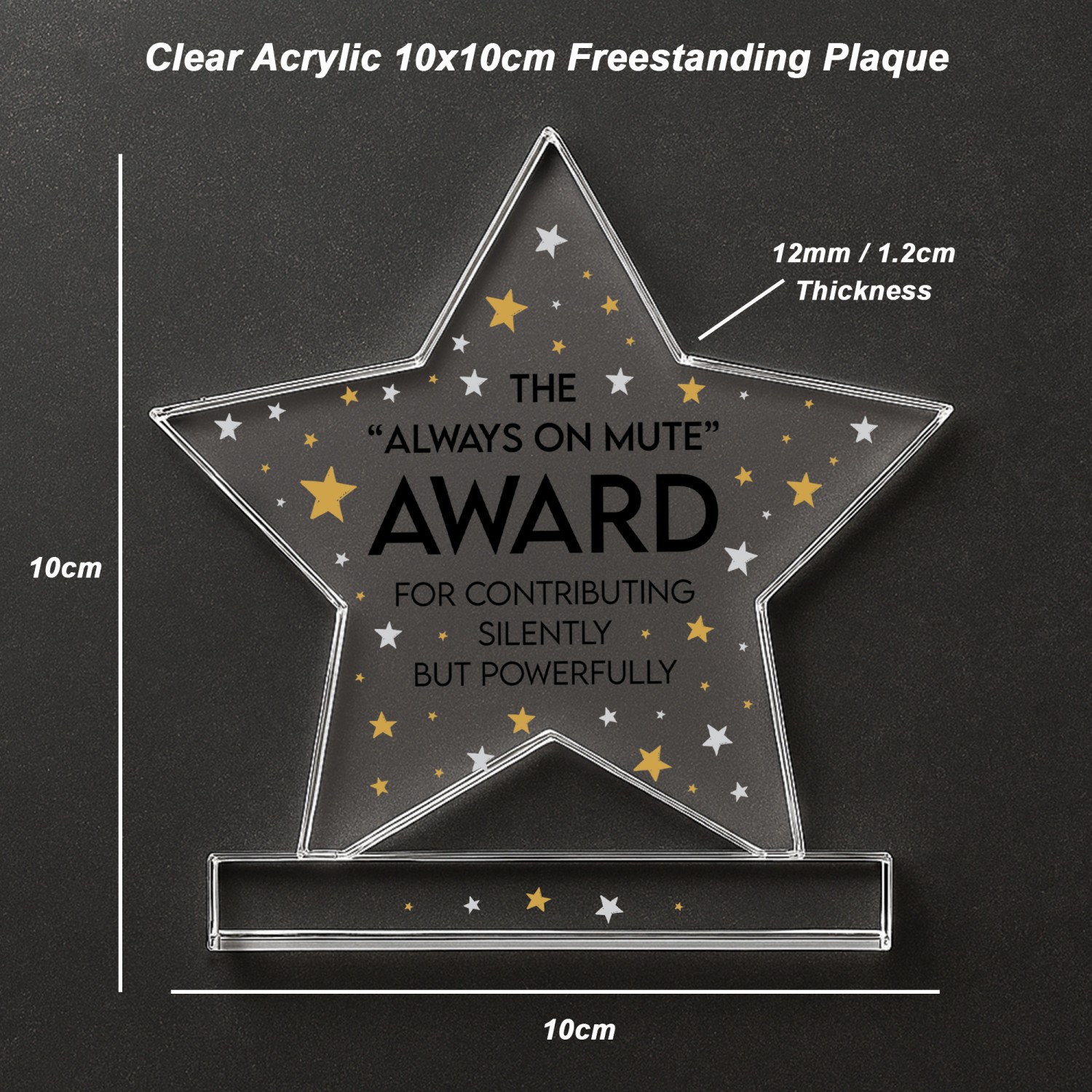Celebrate a remarkable chapter with this elegant freestanding acrylic star plaque, a heartfelt way to honour the joy, memories and accomplishments that come with retirement. Expertly crafted from premium, crystal-clear acrylic, this 10cm by 10cm plaque stands proudly on its own thanks to a solid rectangular base, making it a charming addition to any home or office space.