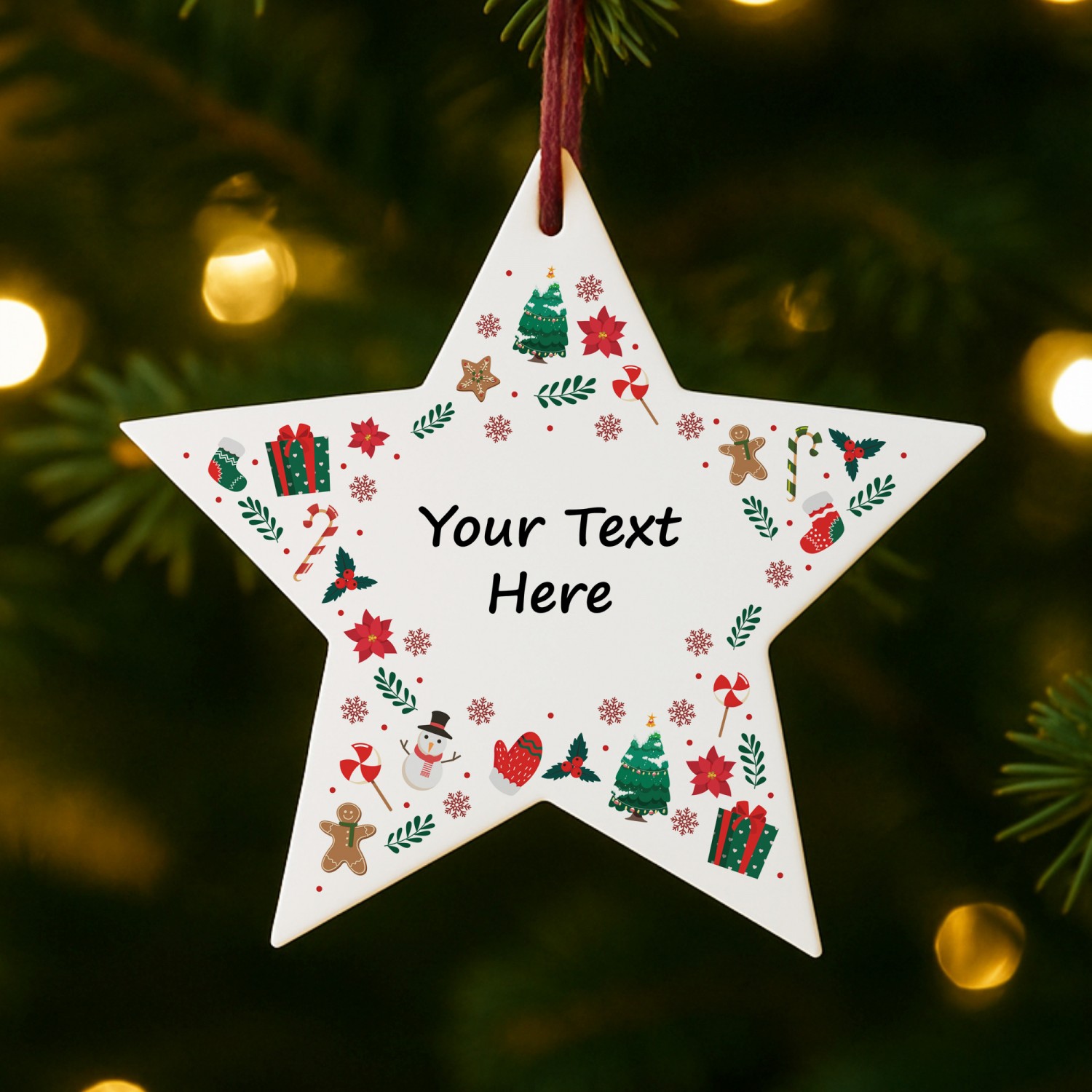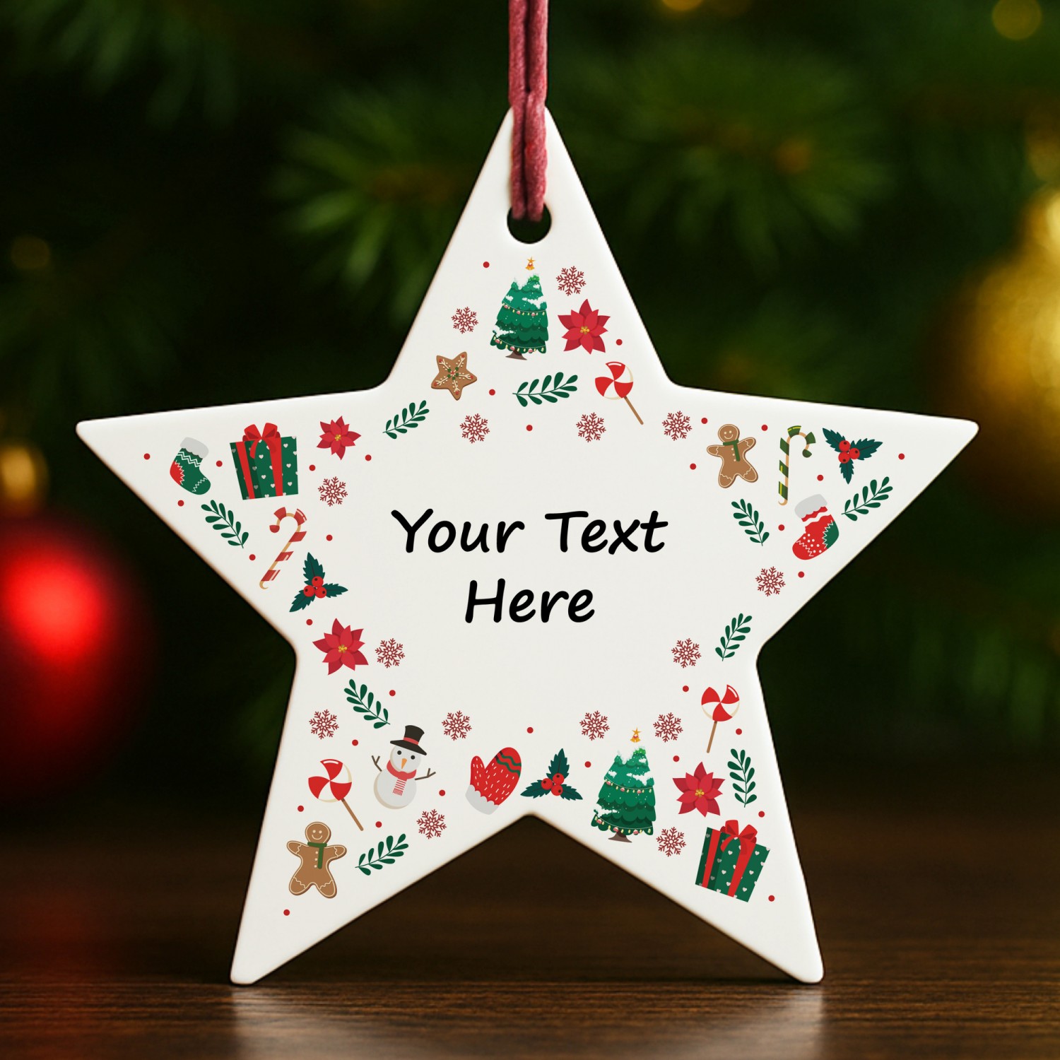The delightful design features classic festive illustrations, including gingerbread men, candy canes, holly sprigs, stars and baubles, framing your own chosen text at the centre. You can customise it with a family name, a heartfelt message, a festive greeting, or even a memorable date, making this decoration perfect for any occasion during the holiday season.
