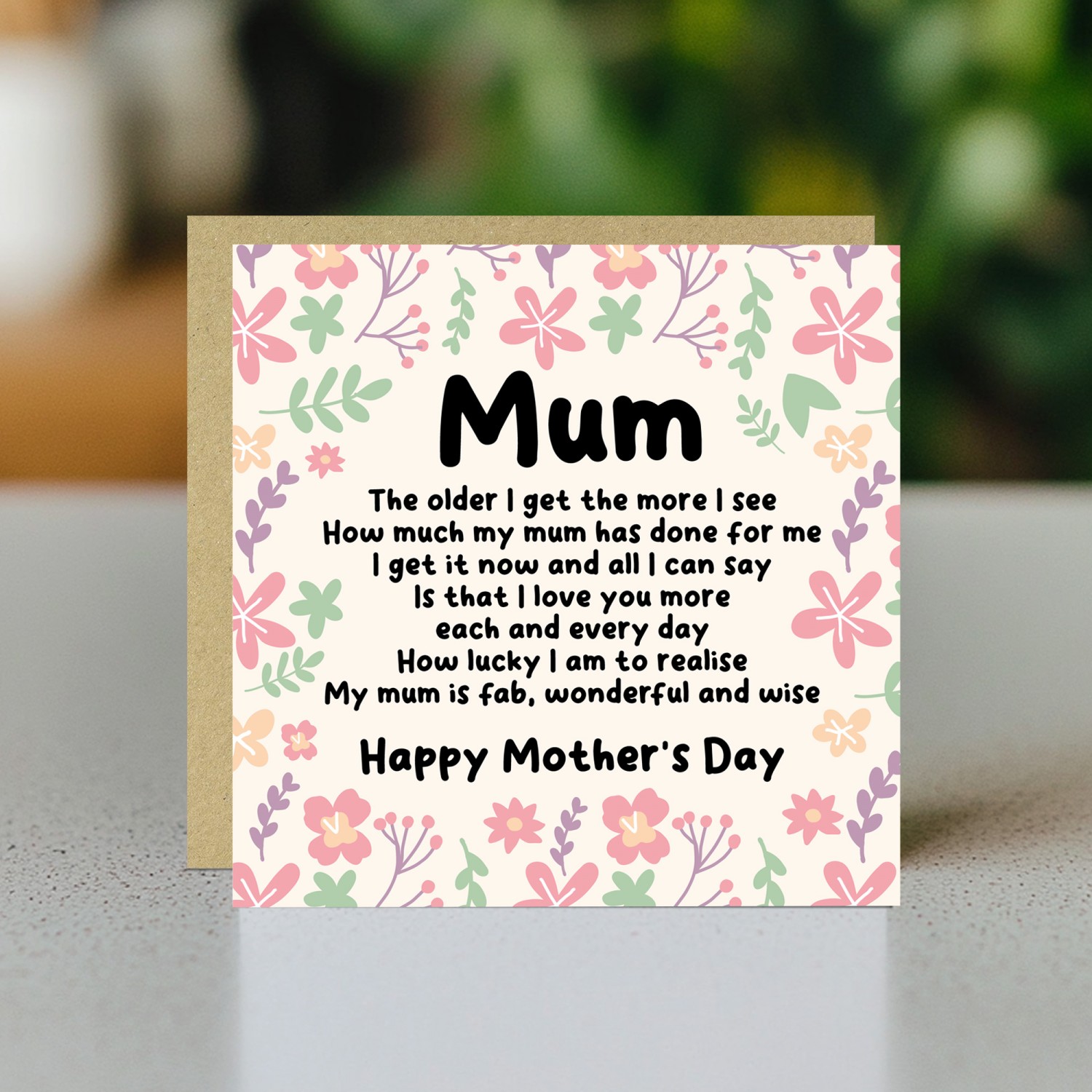 Happy Mothers Day Card, Floral Design, Poem Card For Mum