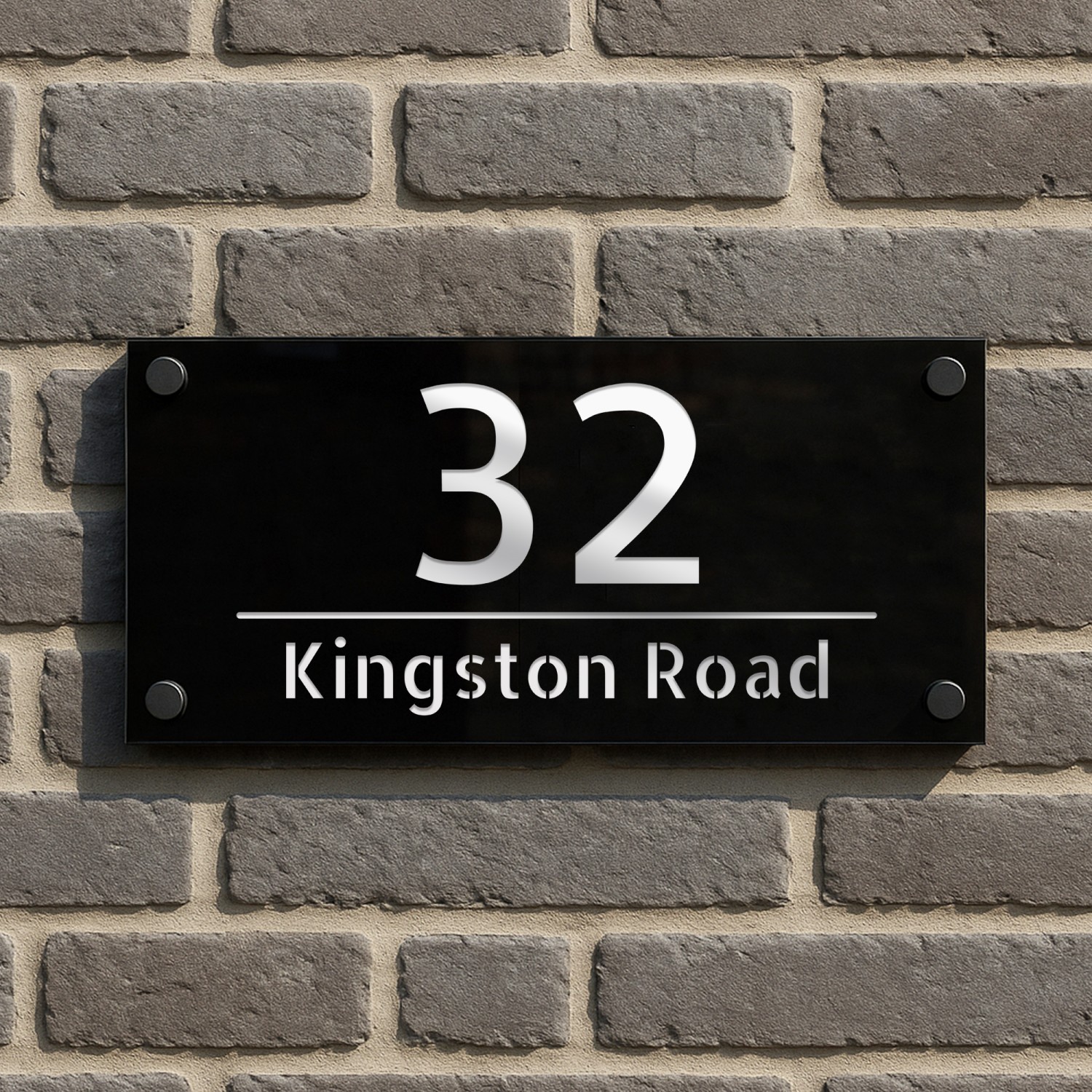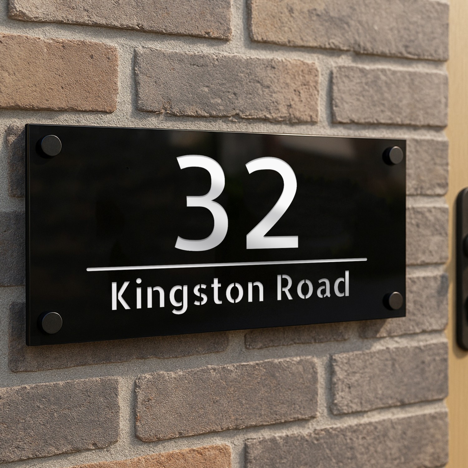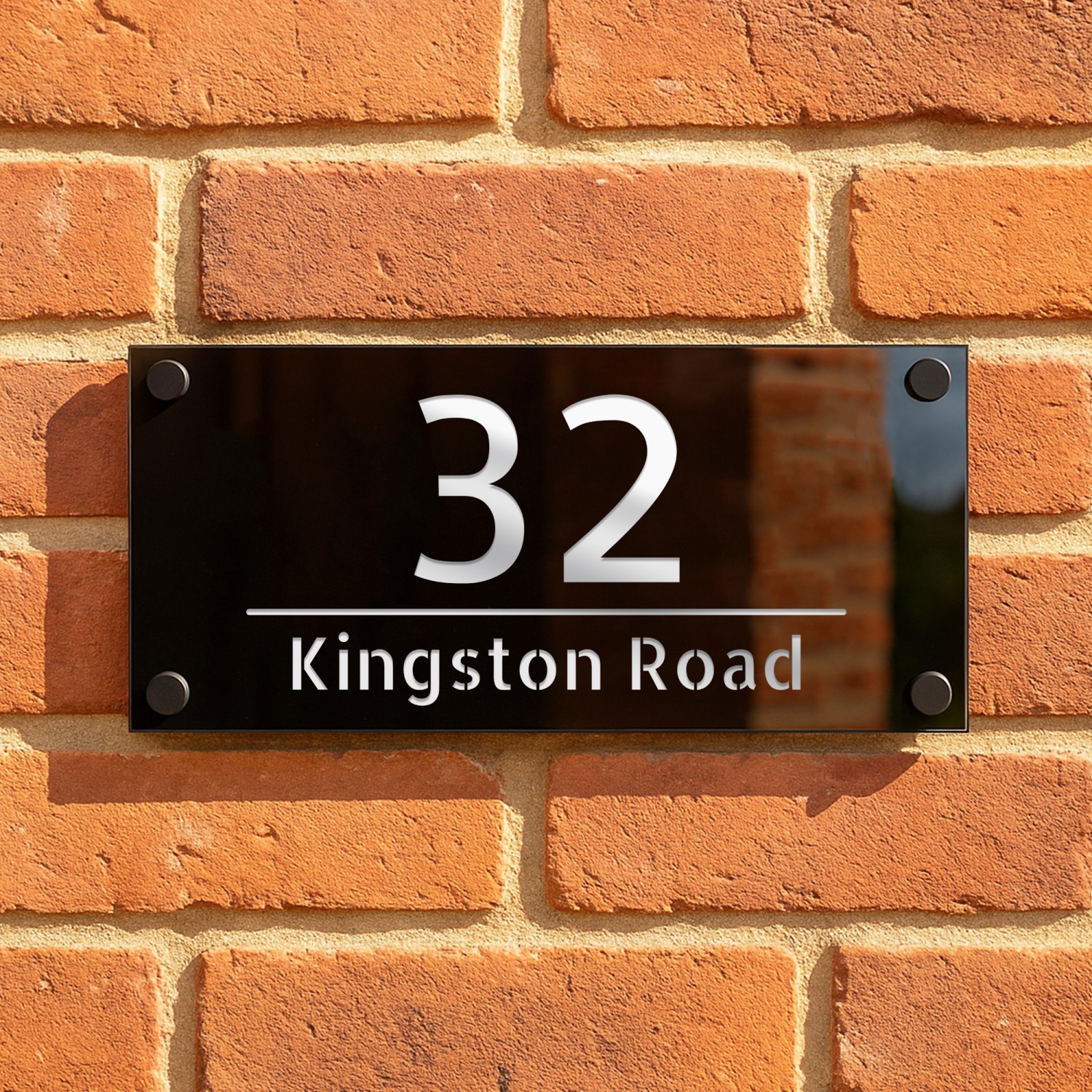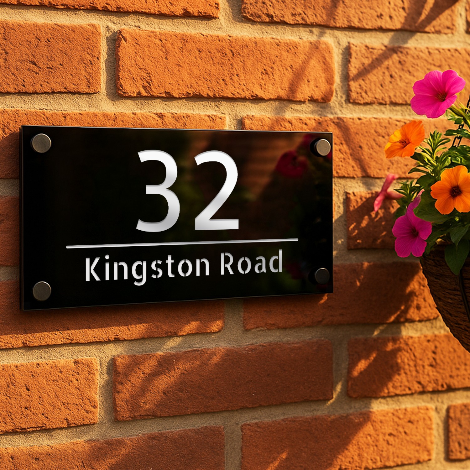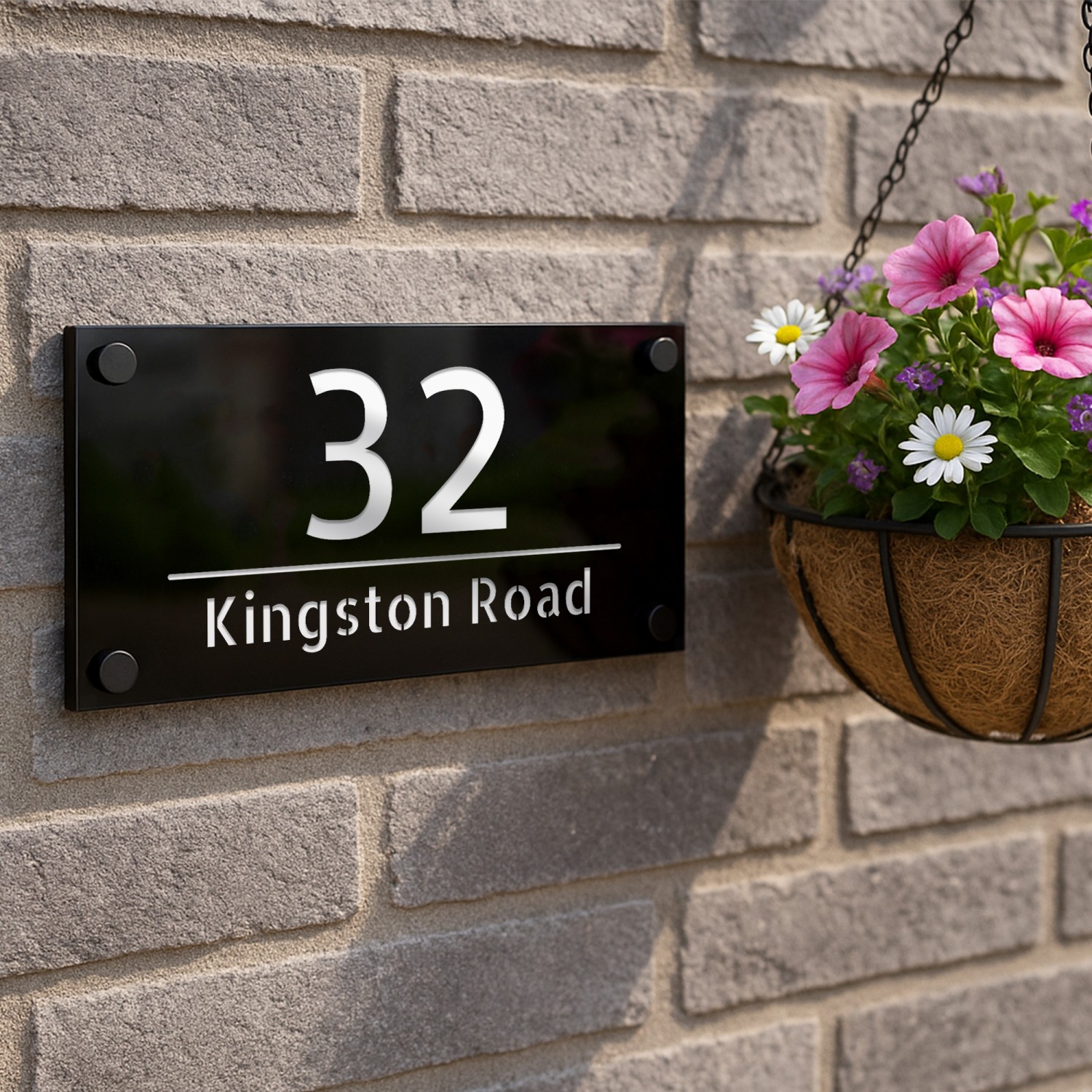 Add a touch of contemporary elegance to your home's exterior with this premium acrylic house sign. Measuring 280 x 140mm, this sleek, modern sign is crafted with a stunning silver mirror back plate and a shiny black front plate, creating a striking contrast that's both stylish and easy to read.