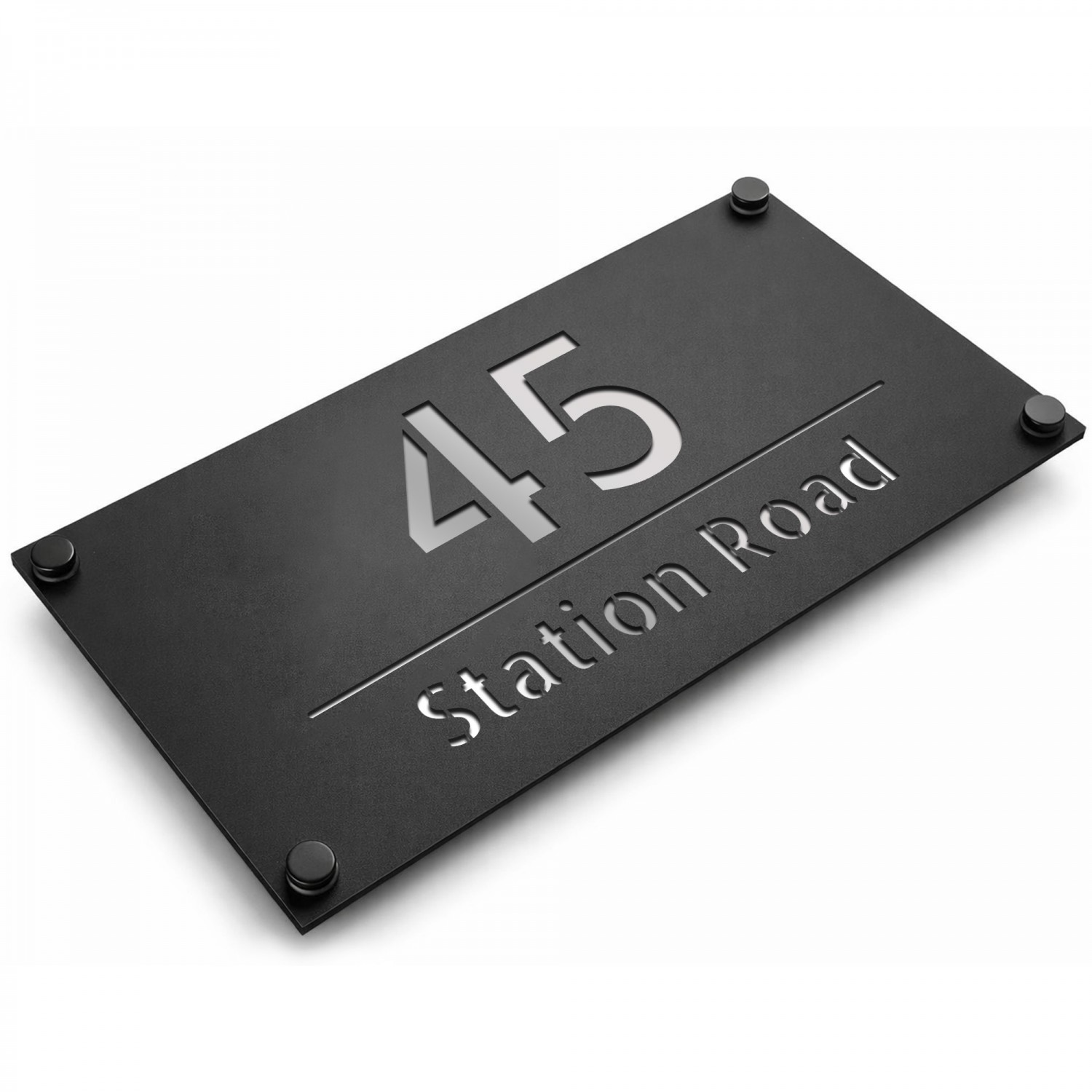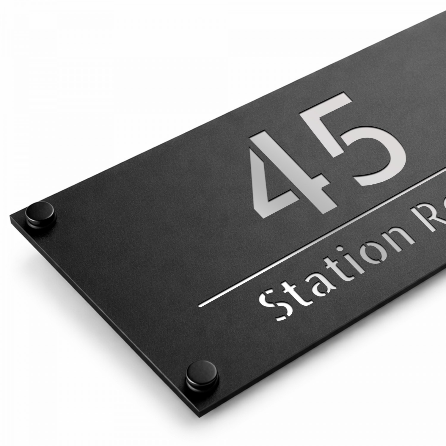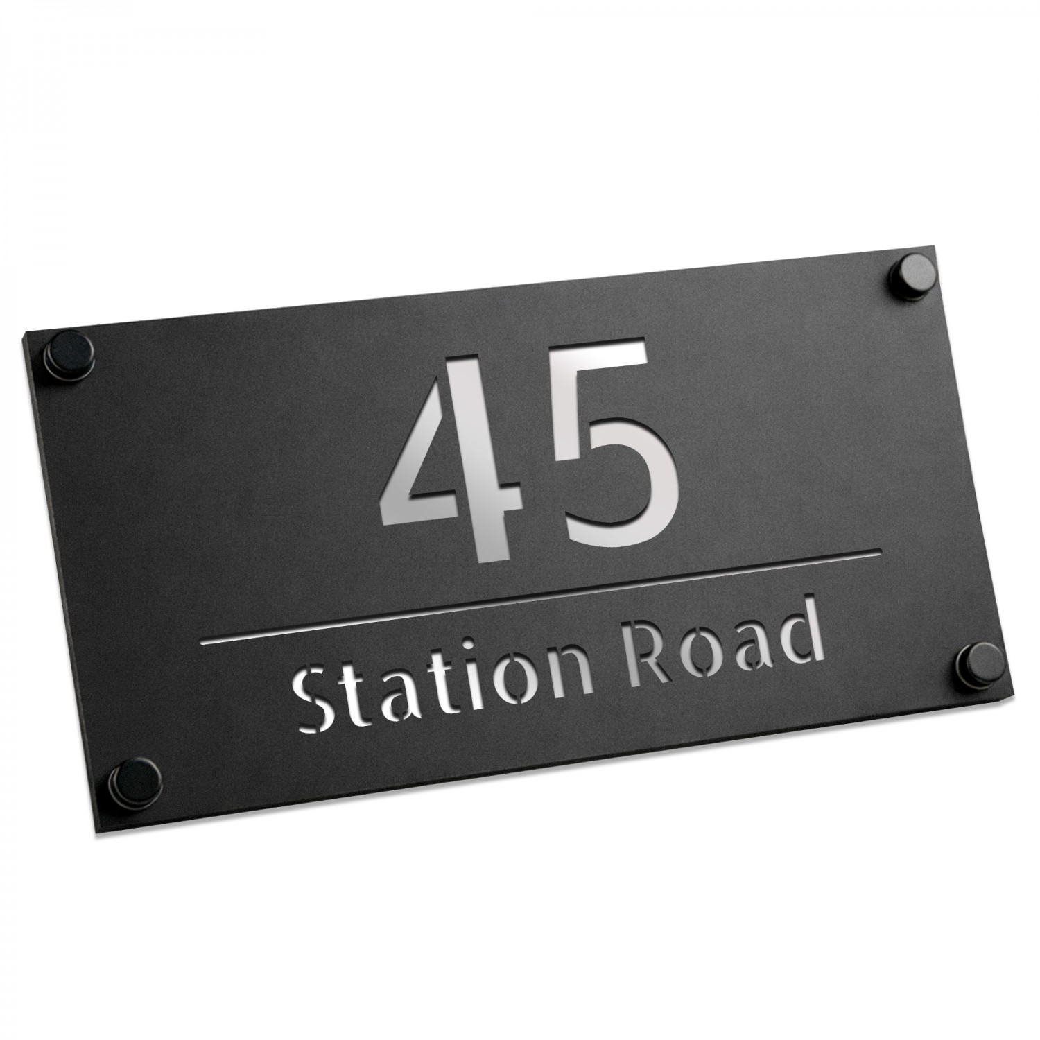 Modern Acrylic House Sign - 280x140mm - Silver Mirror Back Plate with matte Black Front Plate - Laser Cut 3D Design - 4 Matte Black Standoffs