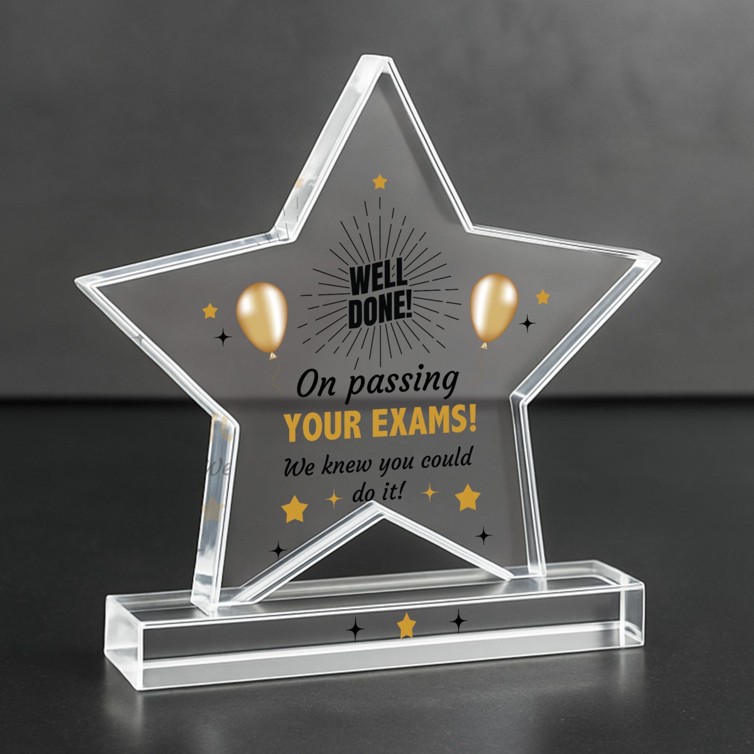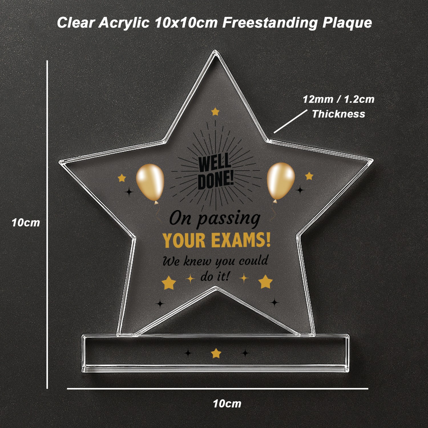 Celebrate a proud milestone with this elegant freestanding acrylic star plaque, congratulate a friend / family member on passing their GCSEs. Crafted from high quality acrylic, this piece measures 10cm by 10cm and stands confidently on its own thanks to a solid rectangular base. It's compact in size but full of sentiment, making it a perfect keepsake for graduates of all ages.