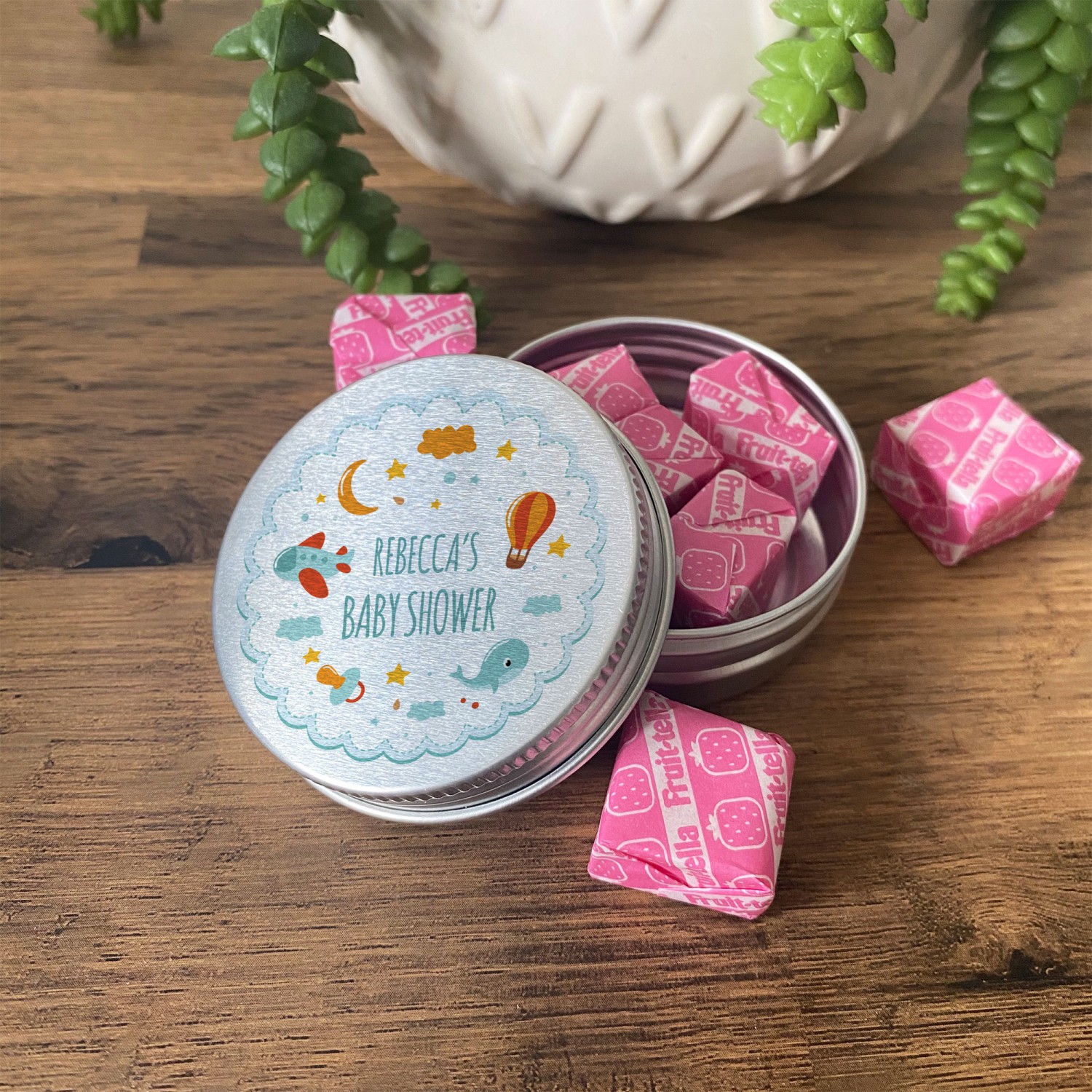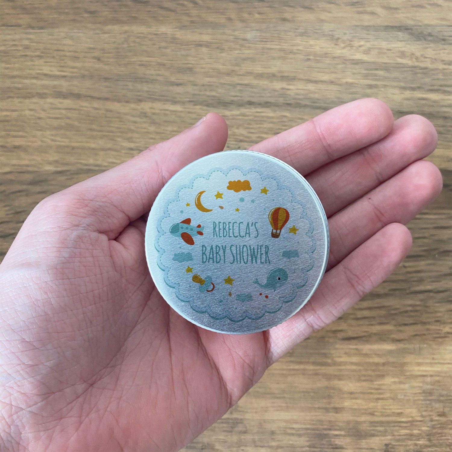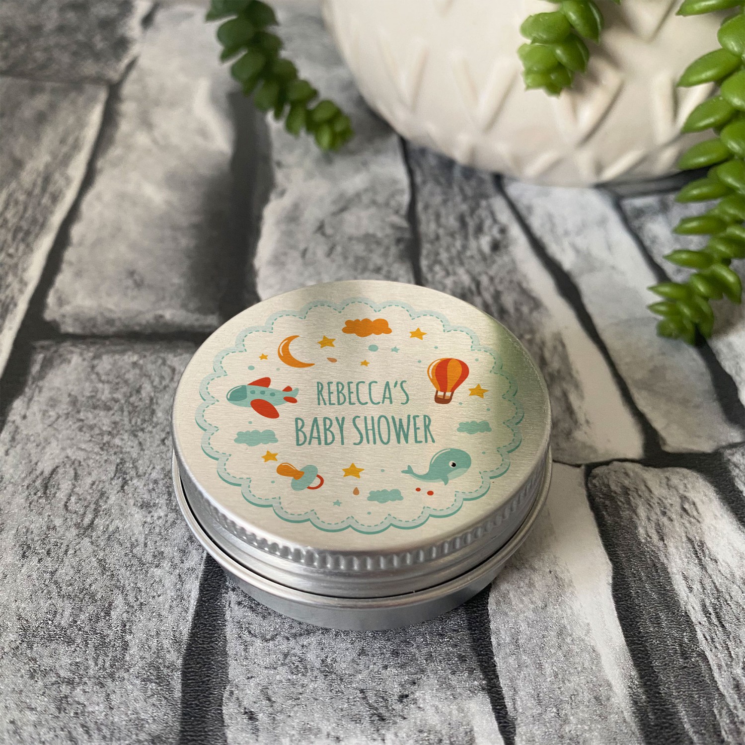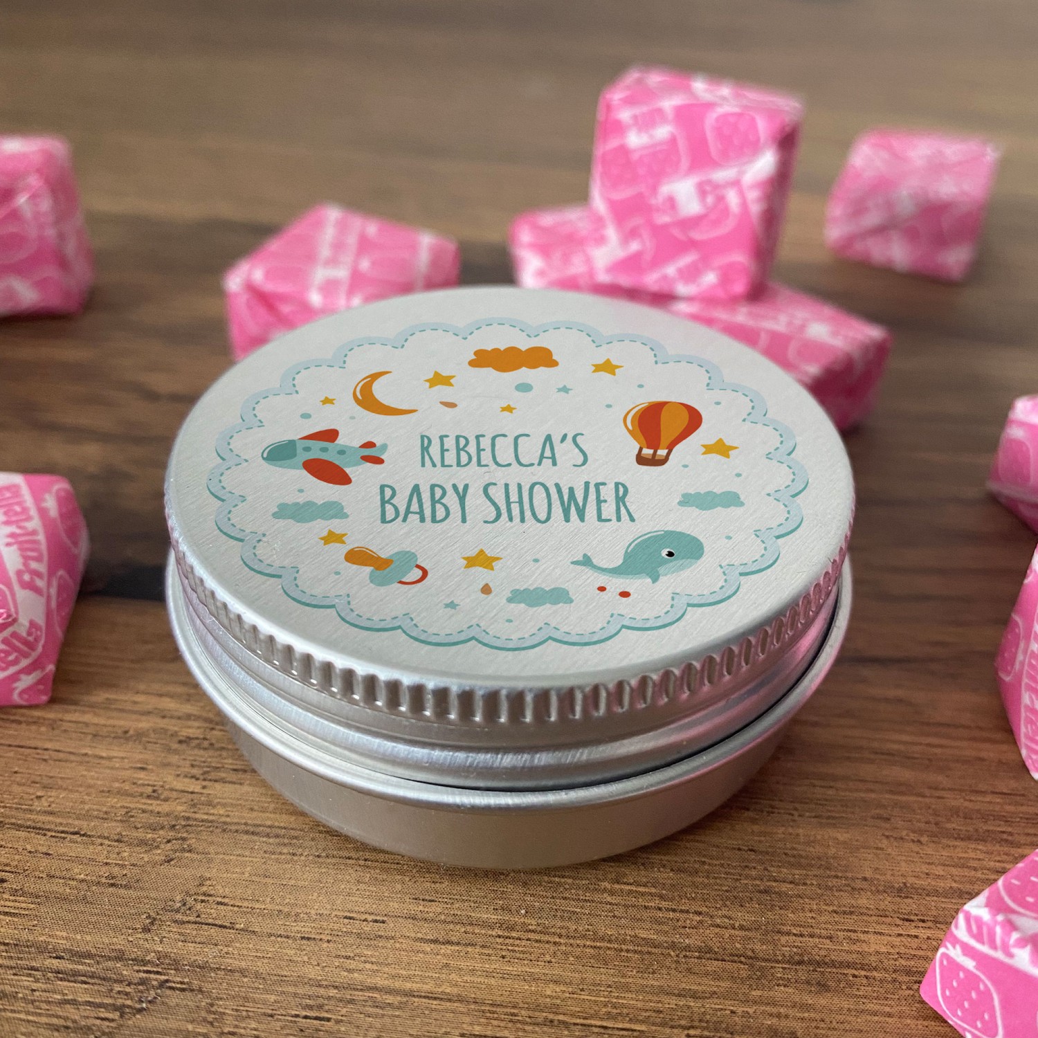 A lovely personalised favour tin for any occassion to put sweets or chocolate in. The perfect table decoration for a wedding, birthday party or stocking filler at christmas. A lovely keepsake that will be treasured for years to come.Baby Shower Gifts! Baby Shower Table Decoration! Baby Shower Favours! Baby Shower Decorations! Baby Shower Decorations Boy!