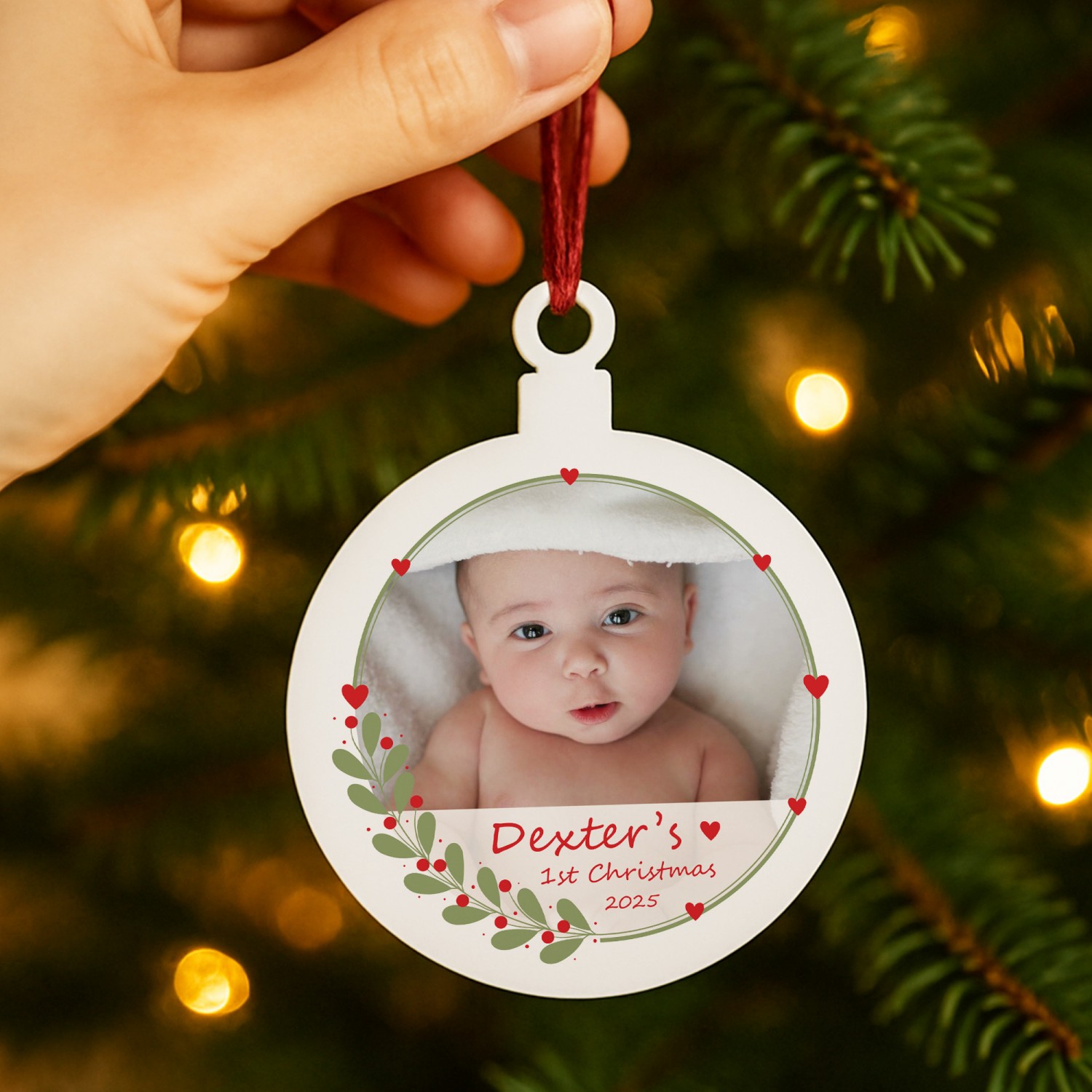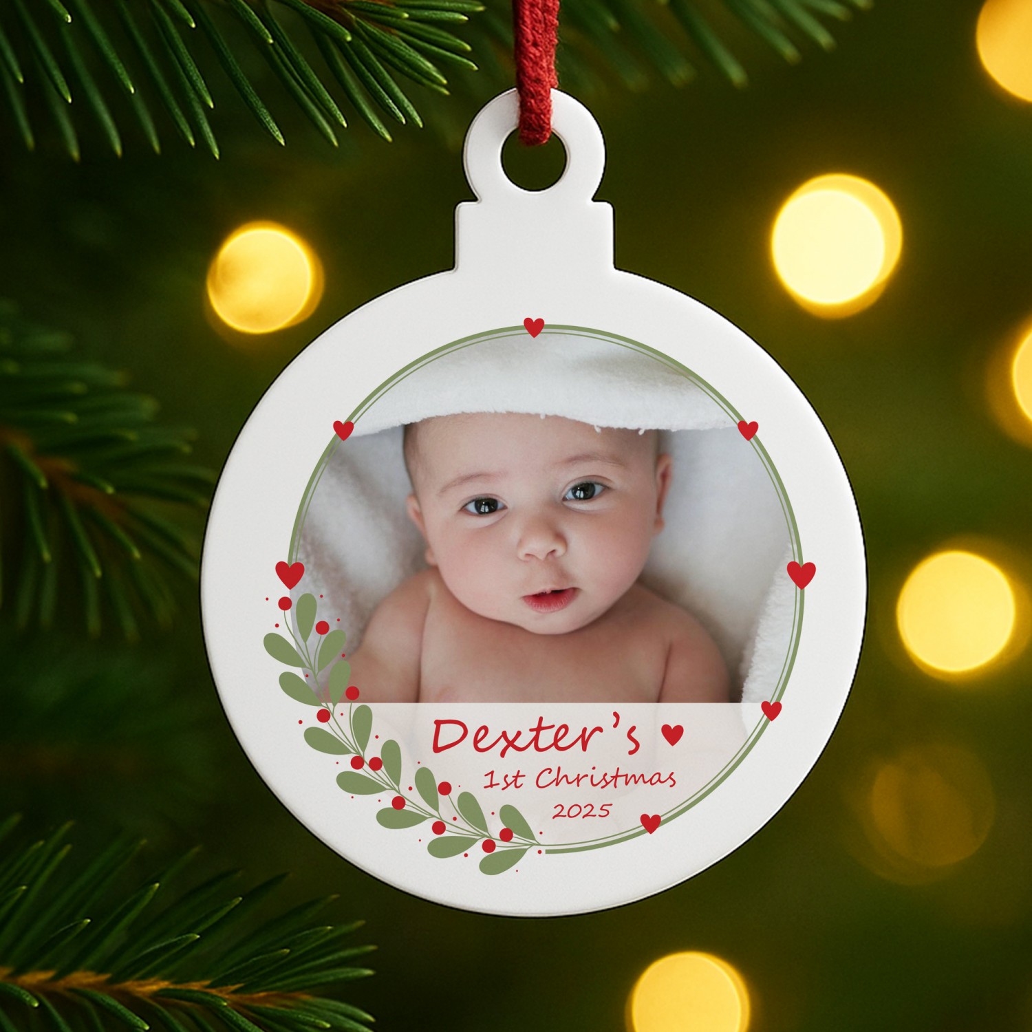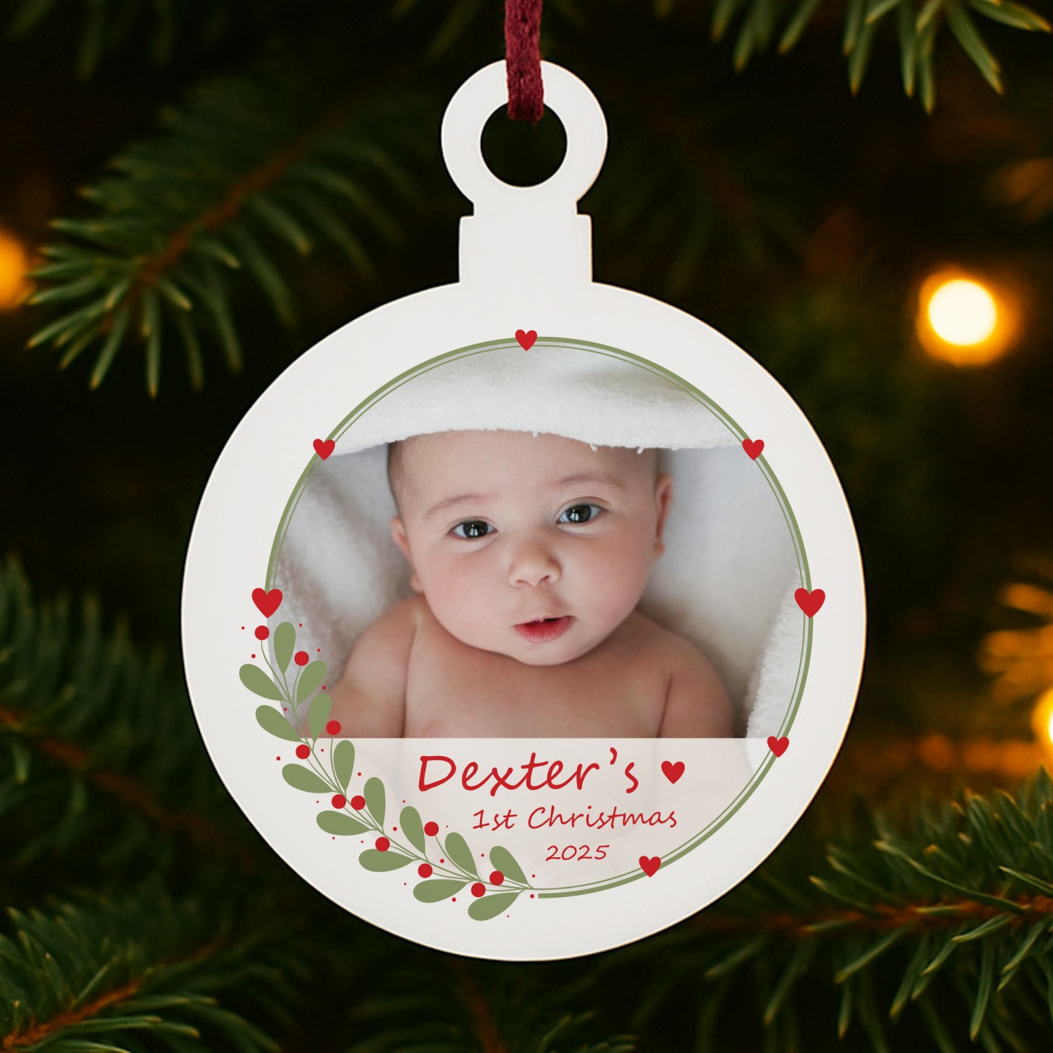 Mark the magic of a baby's very first festive season with this beautifully personalised acrylic Christmas bauble decoration. Measuring 8cm by 10cm, this keepsake ornament is crafted from durable white acrylic with a smooth glossy finish, designed to shine amongst the twinkling fairy lights of your Christmas tree.