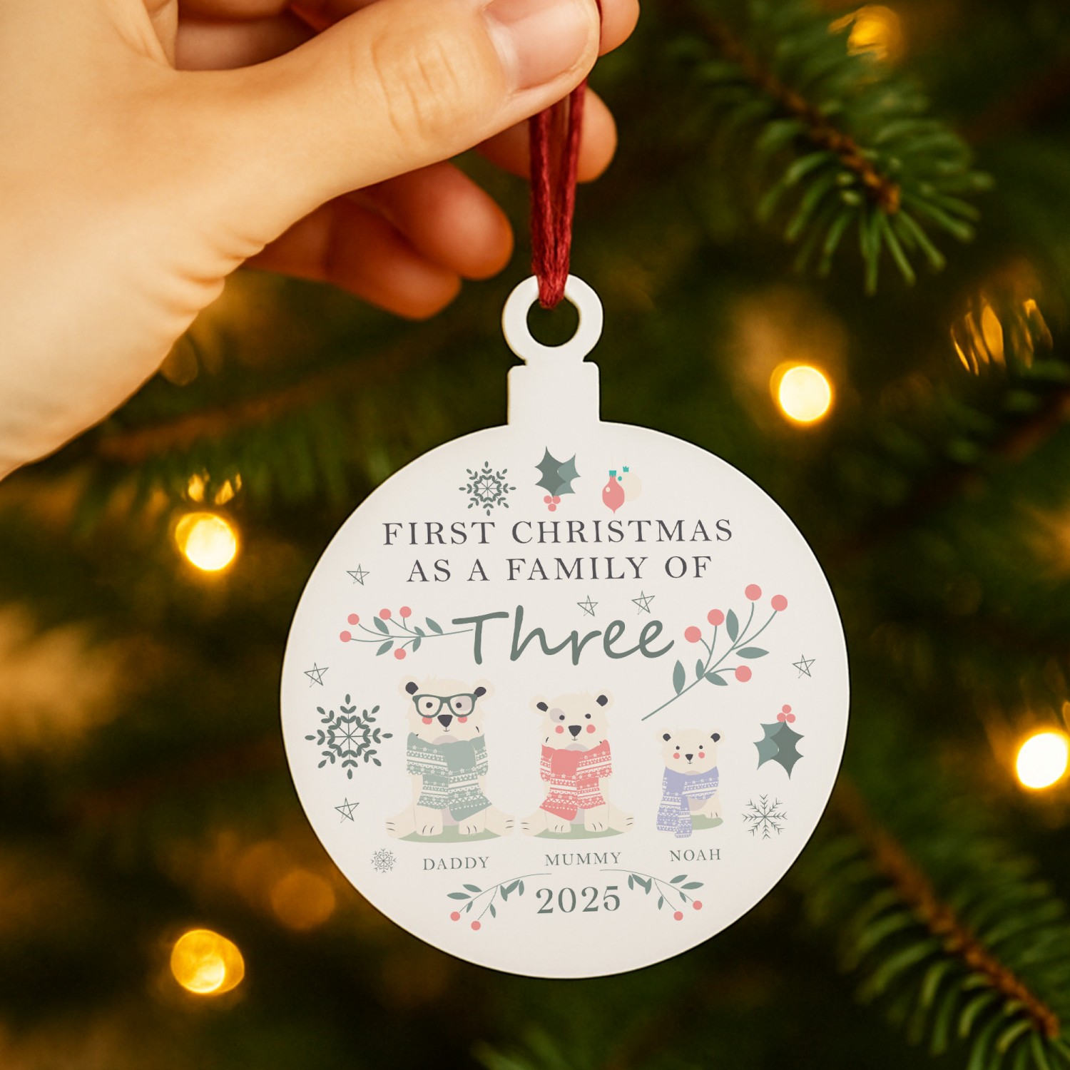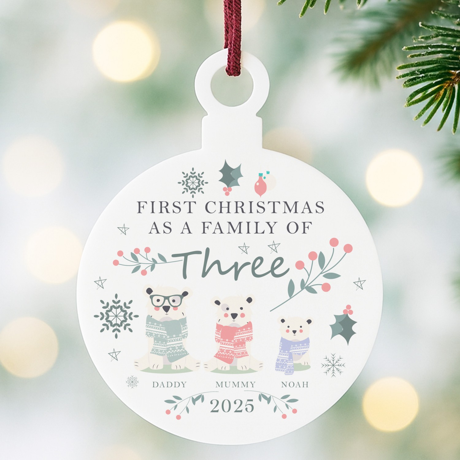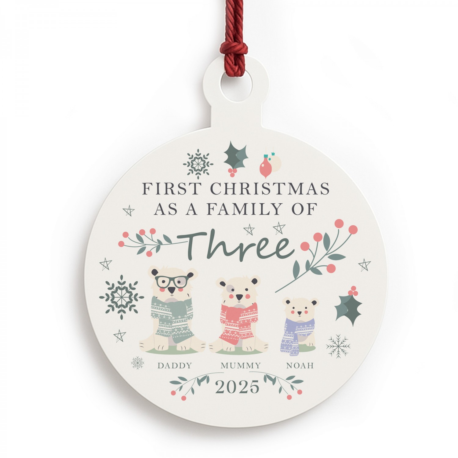 The bauble features the wording 'Our First Christmas as Three' with a sweet festive design of stars , snowflakes and polar bears. Add your family names and the year to create a truly unique decoration that will become a treasured part of your Christmas traditions.