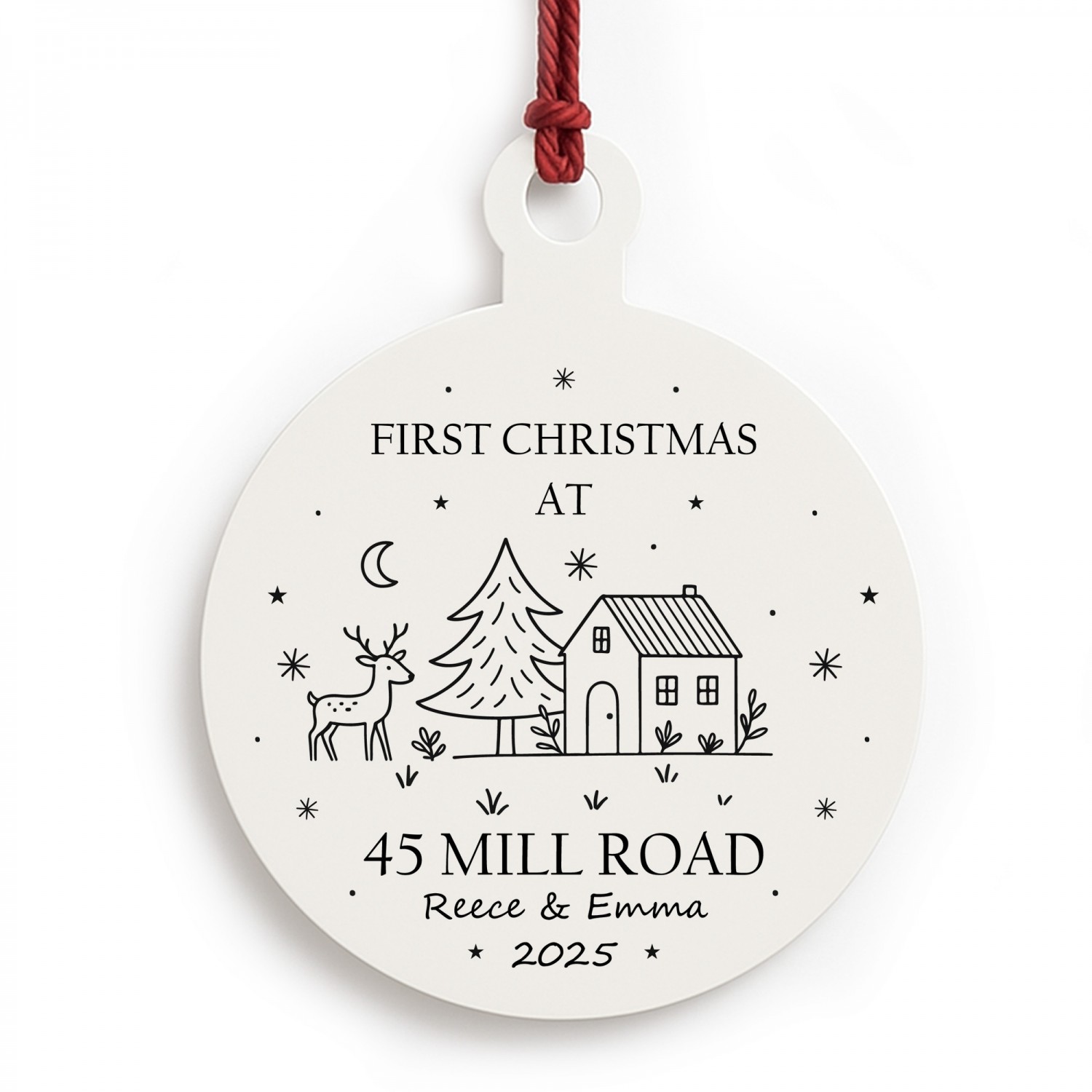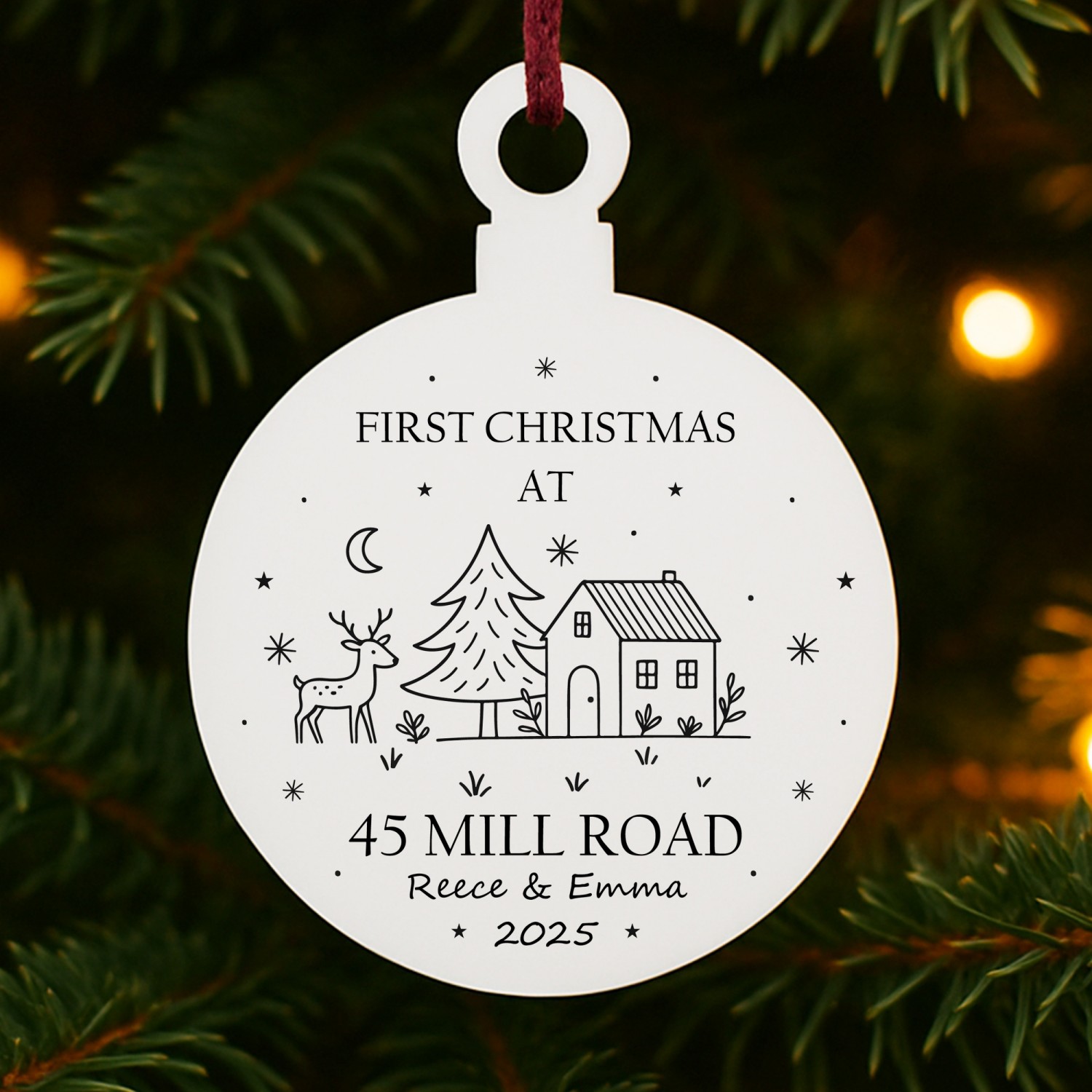 The charming design features a cosy winter scene with a reindeer, tree and house, combined with your chosen address, names and year to create a truly unique new home decoration. Perfect as a thoughtful housewarming gift, a first Christmas bauble for couples, or a special keepsake for yourself, this ornament captures the excitement of settling into a new home during the festive season.