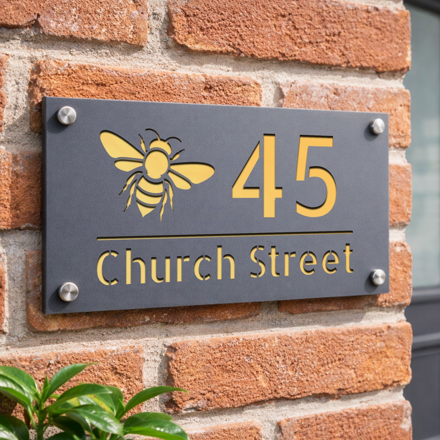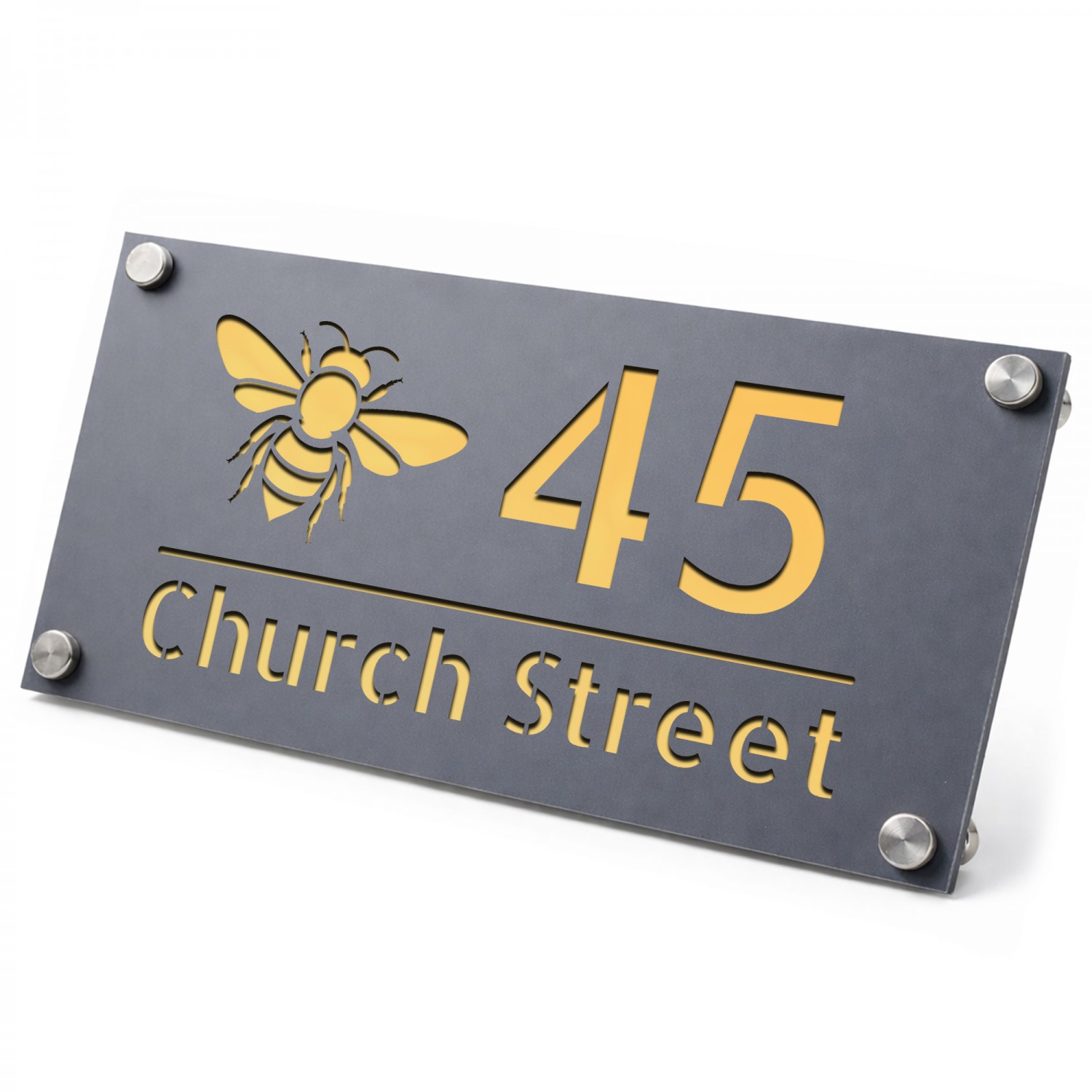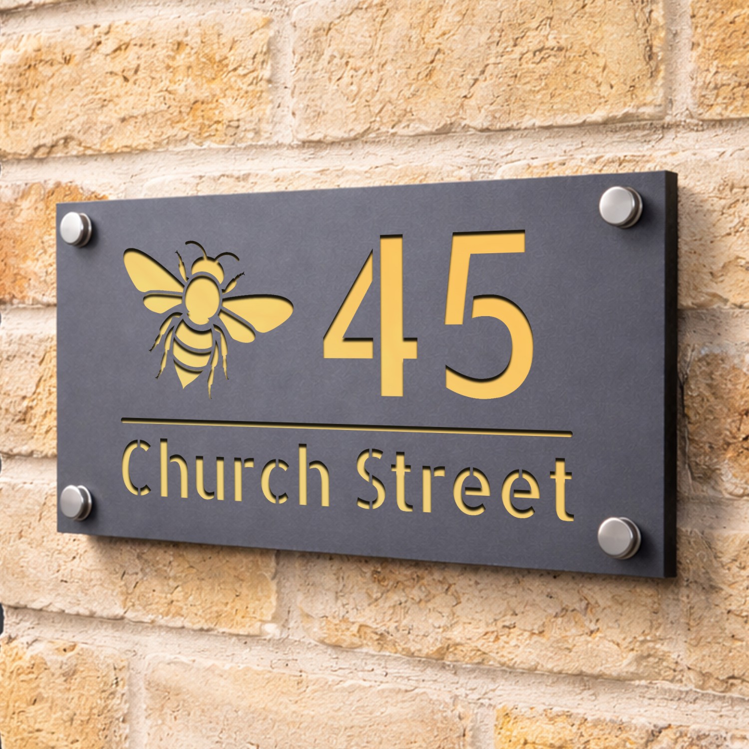 Personalised House Number Sign Bee Design Grey With Gold