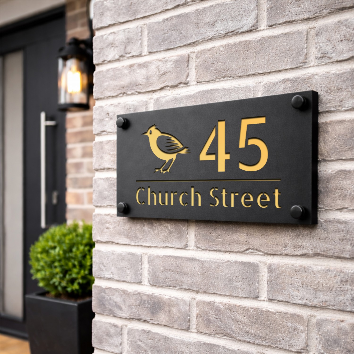 The laser cut 3D numbers and text ensure a crisp, professional finish, while the 4 matte black standoffs add a subtle yet sophisticated mounting detail. Designed for durability, this sign is weather-resistant, UV-protected, and built to withstand the British climate without fading or warping.