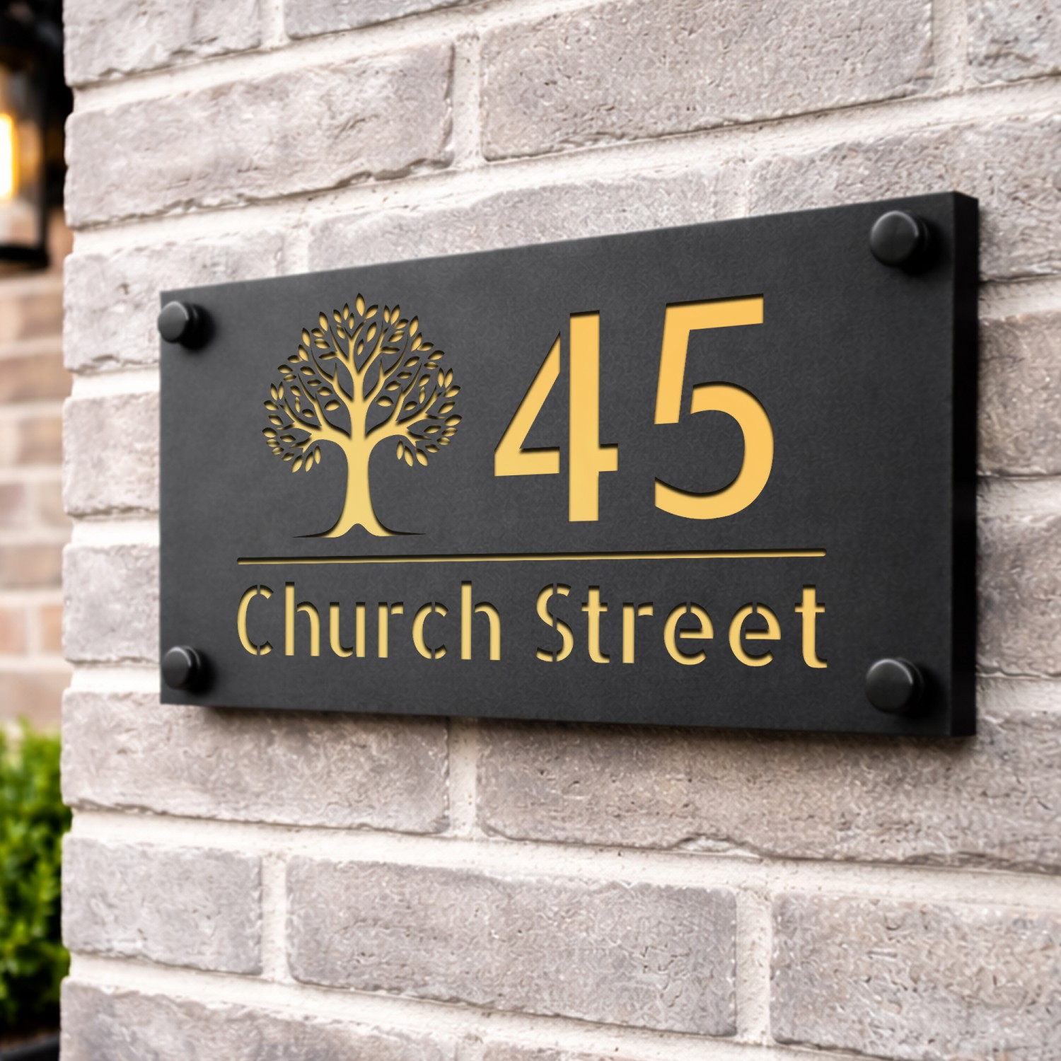 The laser cut 3D numbers and text ensure a crisp, professional finish, while the 4 matte black standoffs add a subtle yet sophisticated mounting detail. Designed for durability, this sign is weather-resistant, UV-protected, and built to withstand the British climate without fading or warping.