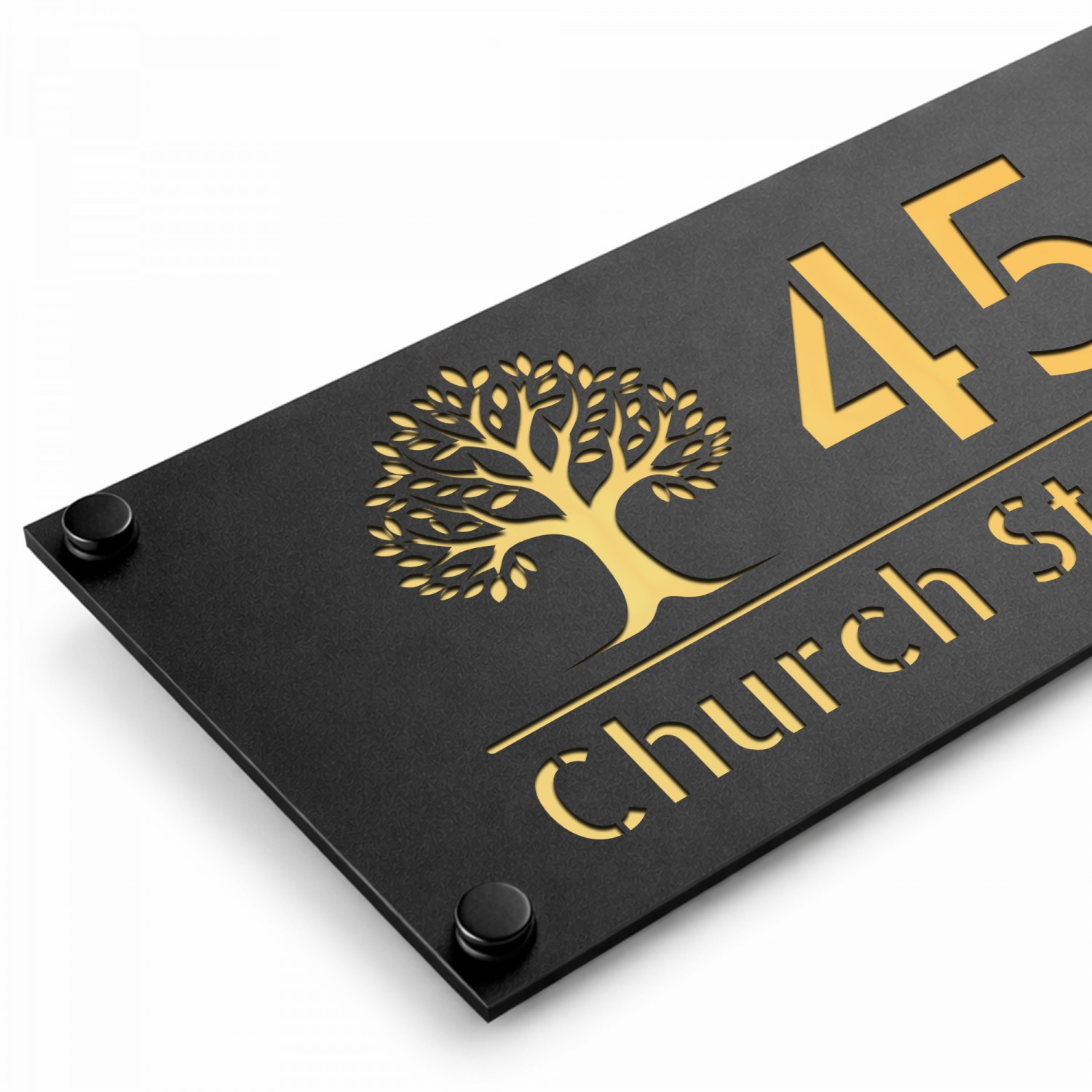 Modern Acrylic House Sign - 280x140mm - Gold Mirror Back Plate with Matte Black Front Plate - Laser Cut 3D Design - 4 Matte Black Standoffs
