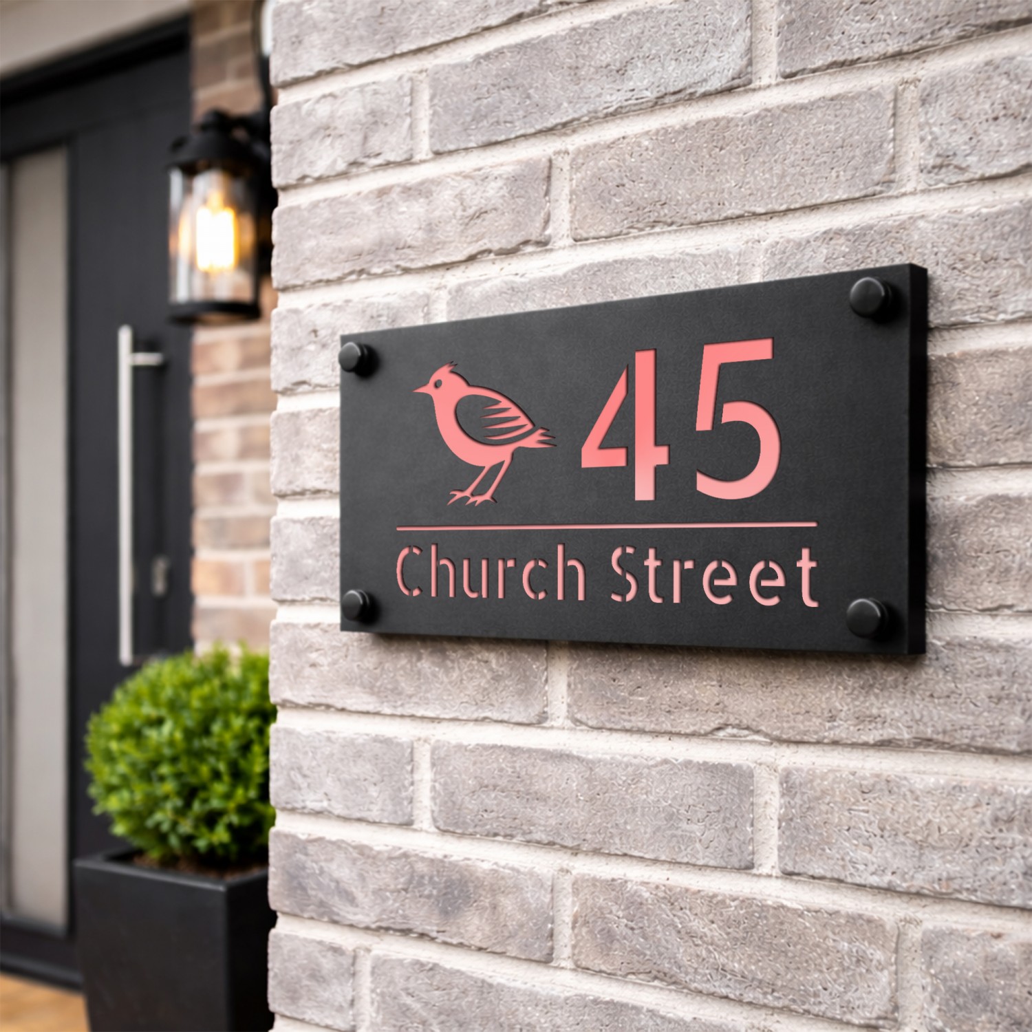 The laser cut 3D numbers and text ensure a crisp, professional finish, while the 4 matte black standoffs add a subtle yet sophisticated mounting detail. Designed for durability, this sign is weather-resistant, UV-protected, and built to withstand the British climate without fading or warping.
