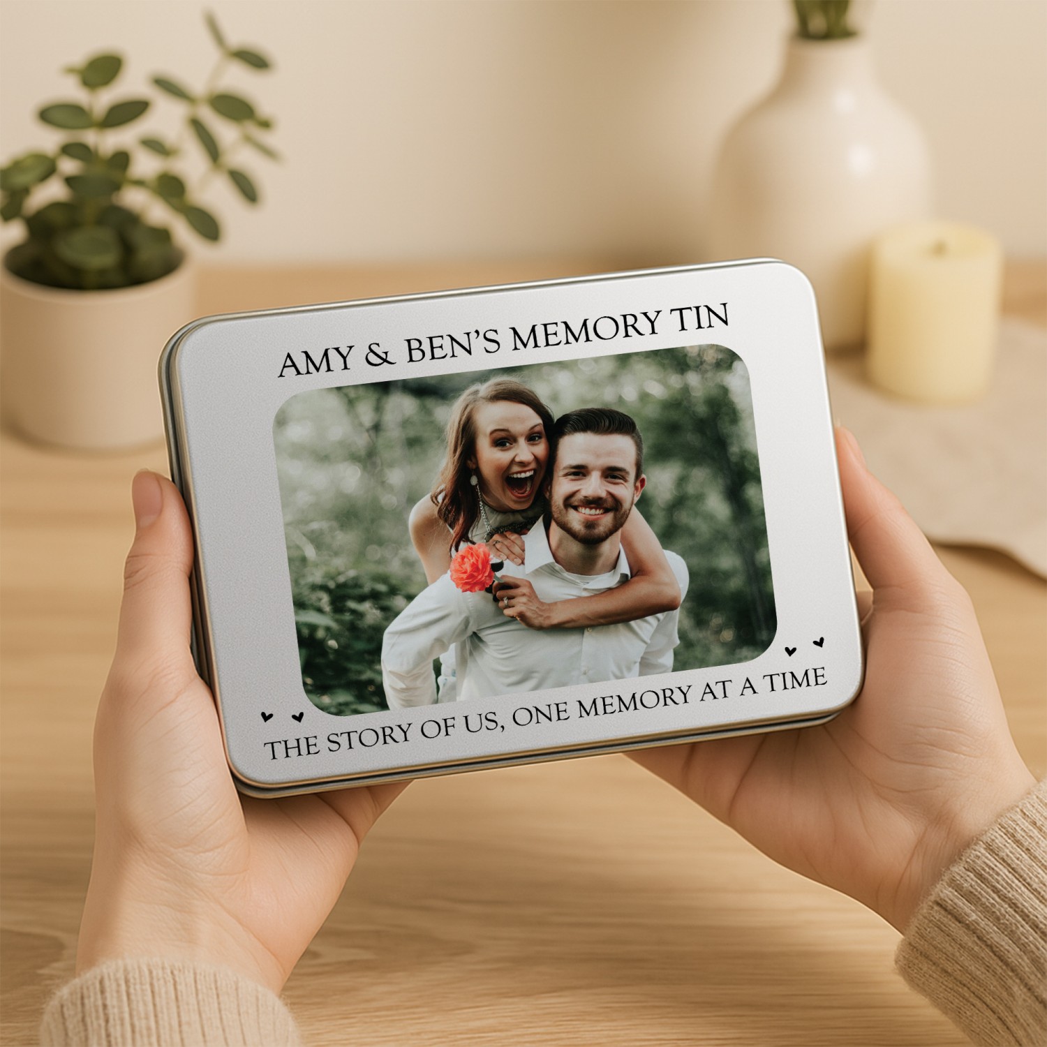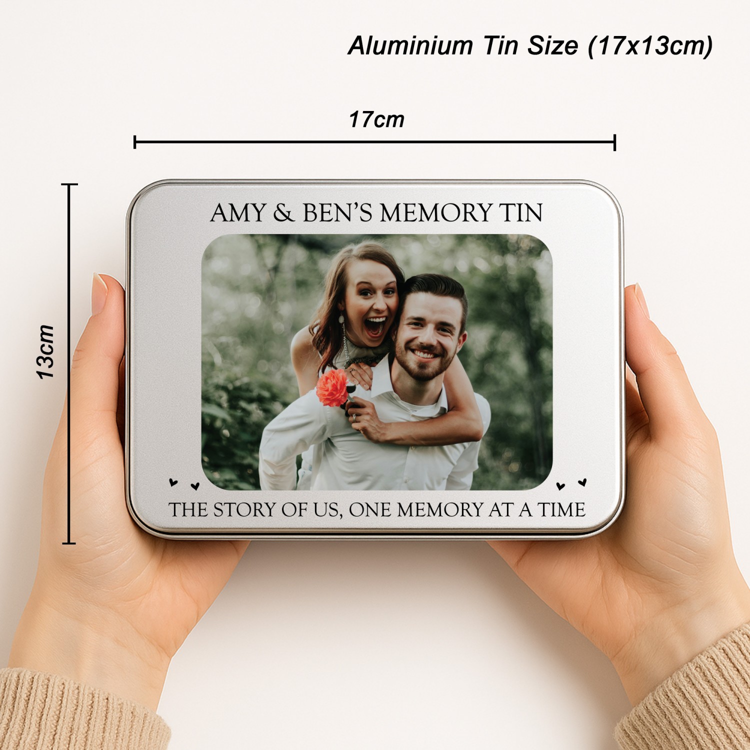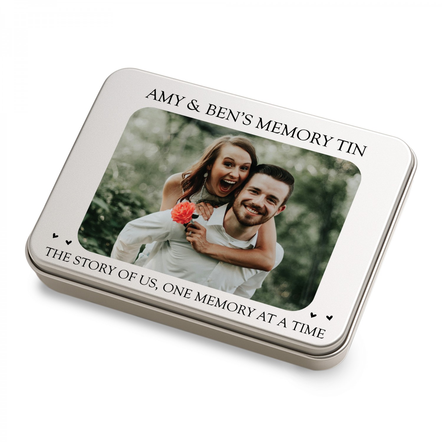Personalisation is key with our product, allowing you to imprint your chosen photos, names, or dates onto the surface of the tin. Whether it's a cherished family portrait or a significant anniversary, our printing process ensures that your memories are beautifully showcased.