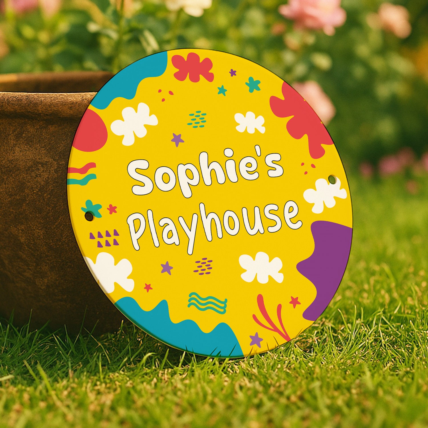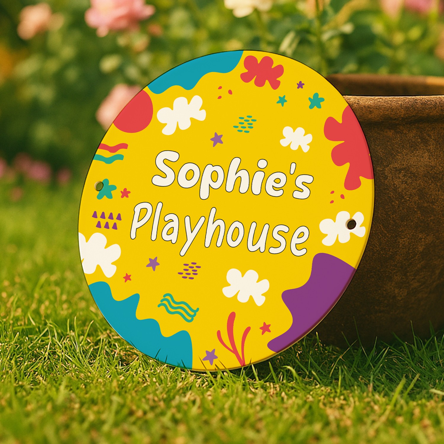 Designed with practicality in mind, this round personalised playhouse sign includes pre-drilled holes for easy mounting, allowing you to securely fix it to a playhouse door, garden fence, wall, shed, or bedroom wall. Its circular shape adds a stylish and unique look compared to standard rectangular plaques.