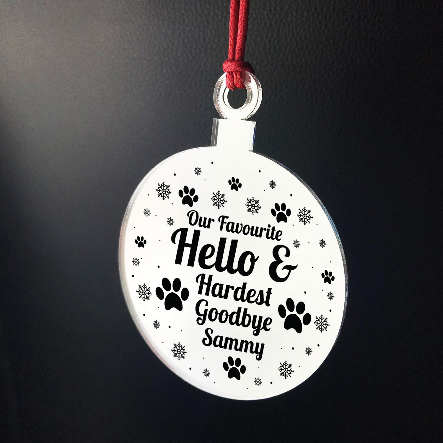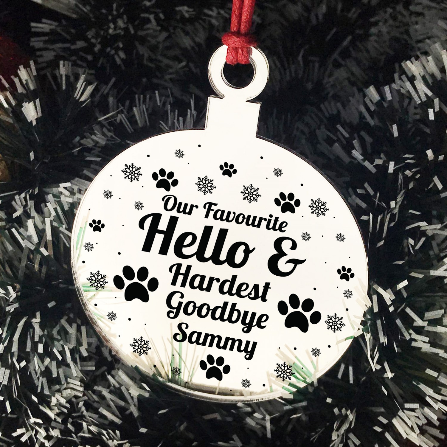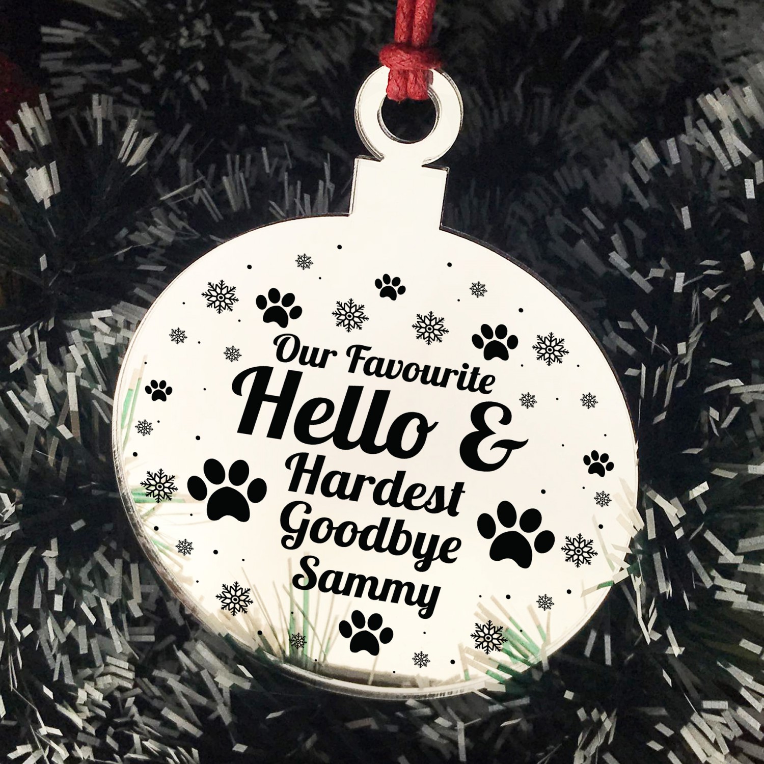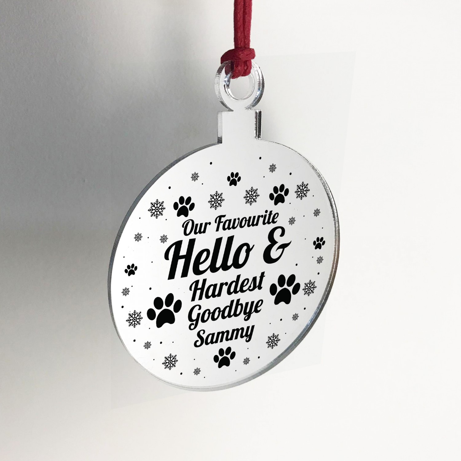The sign is made from mirrored acrylic, and the design is permanently printed into the bauble. The mirror bauble is supplied with waxed cotton rope in both black and red colours to allow easy hanging and looks great in any room of the house.