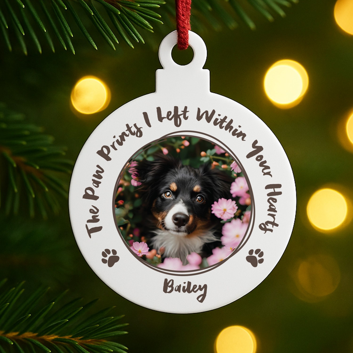 The thoughtful design features sweet paw prints and snowflakes, surrounding your pet's name and the year with a beautiful photo, making it a beautiful way to keep their presence close during the festive season. Perfect for remembering a much-loved companion, this ornament offers comfort and a lasting tribute that can be cherished year after year.