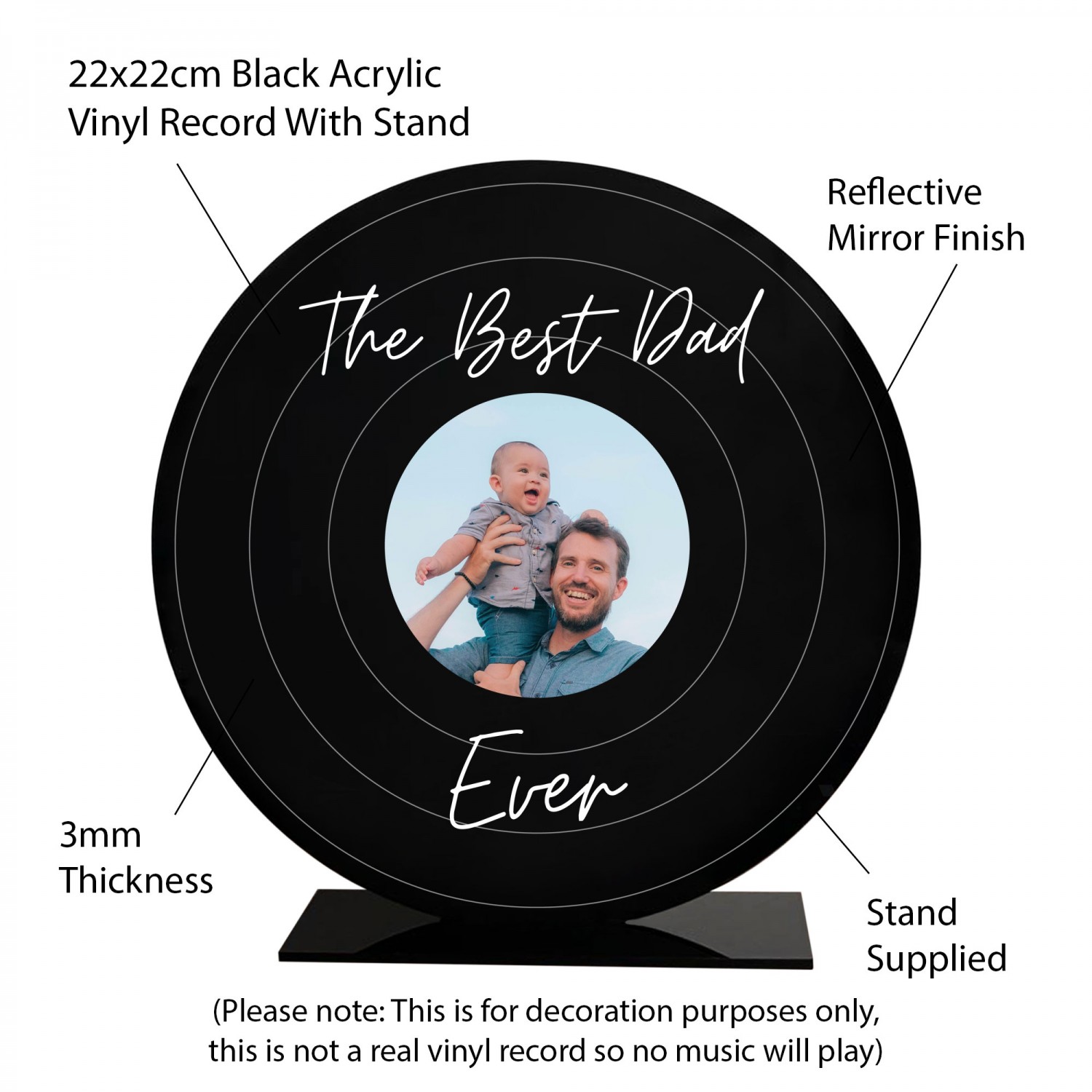 Crafted from premium quality black acrylic, the plaque measures 22cm x 22cm and boasts a sleek finish. Its 3mm thickness ensures durability while maintaining a refined appearance. The vinyl inspired design is expertly printed directly onto the acrylic surface, creating a flawless, professional look. Although it mimics the aesthetic of a traditional vinyl record, this plaque is purely decorative and serves as a stylish and sentimental display piece.