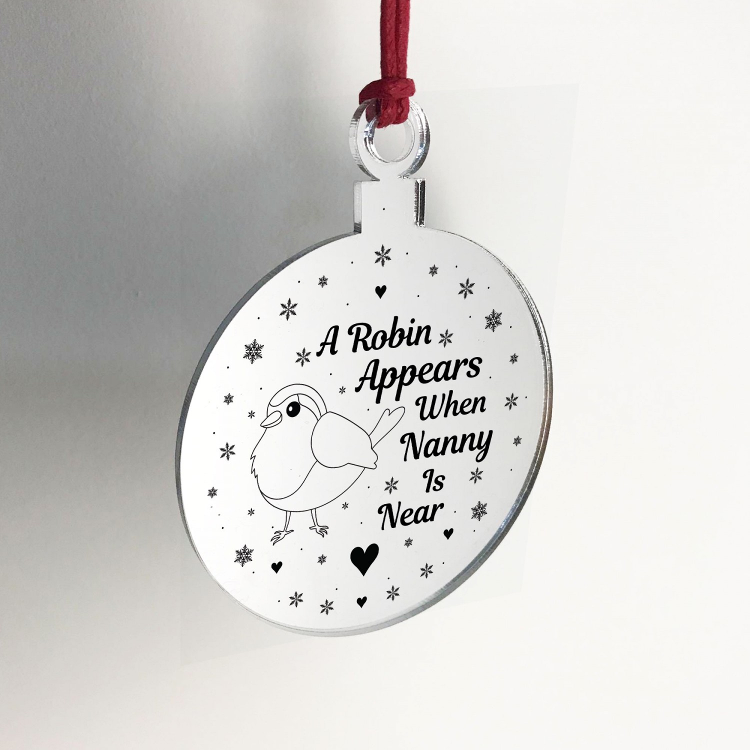 The sign is made from mirrored acrylic, and the design is permanently printed into the bauble. The mirror bauble is supplied with waxed cotton rope in both black and red colours to allow easy hanging and looks great in any room of the house.