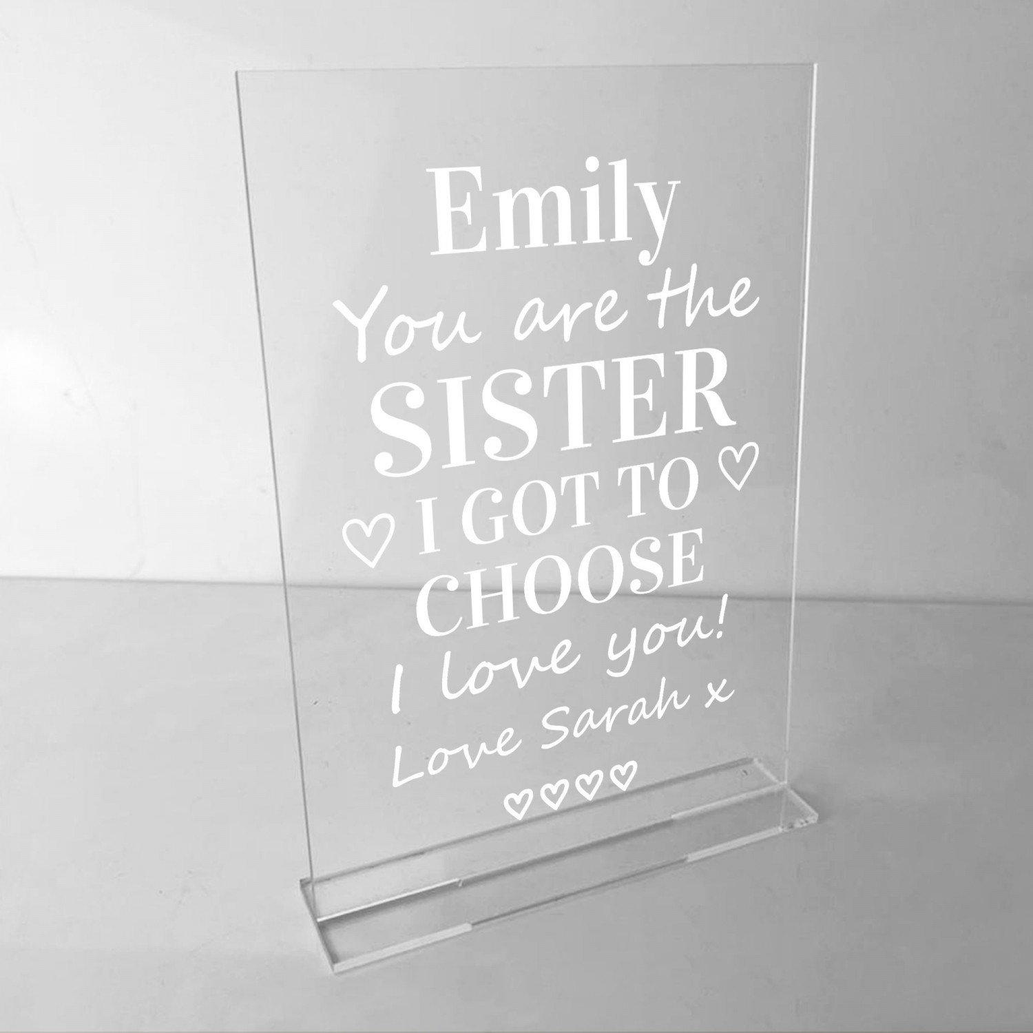 A Beautifully Printed A5 Personalised Clear Acrylic standing plaque with the personalisation of your choice (Recipient and Sender Name) and a heartfelt message to give to your best friend! Give this gift with love to your friend who is more like a sister and put a smile their face when they receive this and can put it up in their home. A perfect sentimental gift that will be read, over and over again! This gorgeous plaque makes an amazing Birthday or Christmas gift but is also a great gift anytime of the year. Supplied with a stand, a beautiful keepsake that will be treasured for years to come.