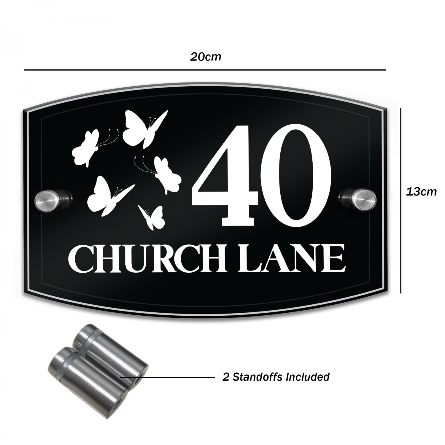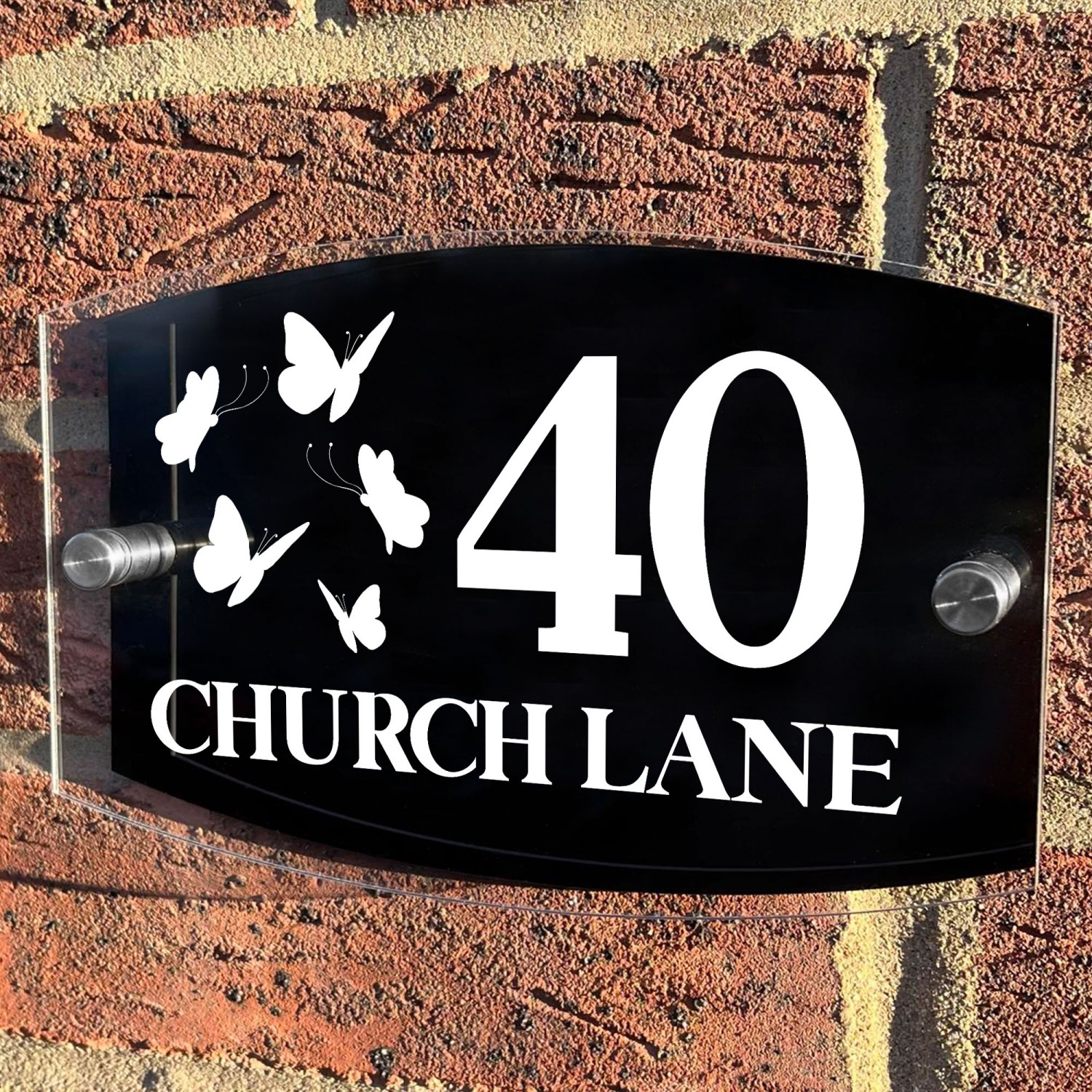 Measuring a sleek 20x13cm, it's the perfect canvas for displaying your house number and chosen design. The clear acrylic provides a polished backdrop for the printed details, while the black acrylic backing adds depth and contrast, creating a striking visual impact.
