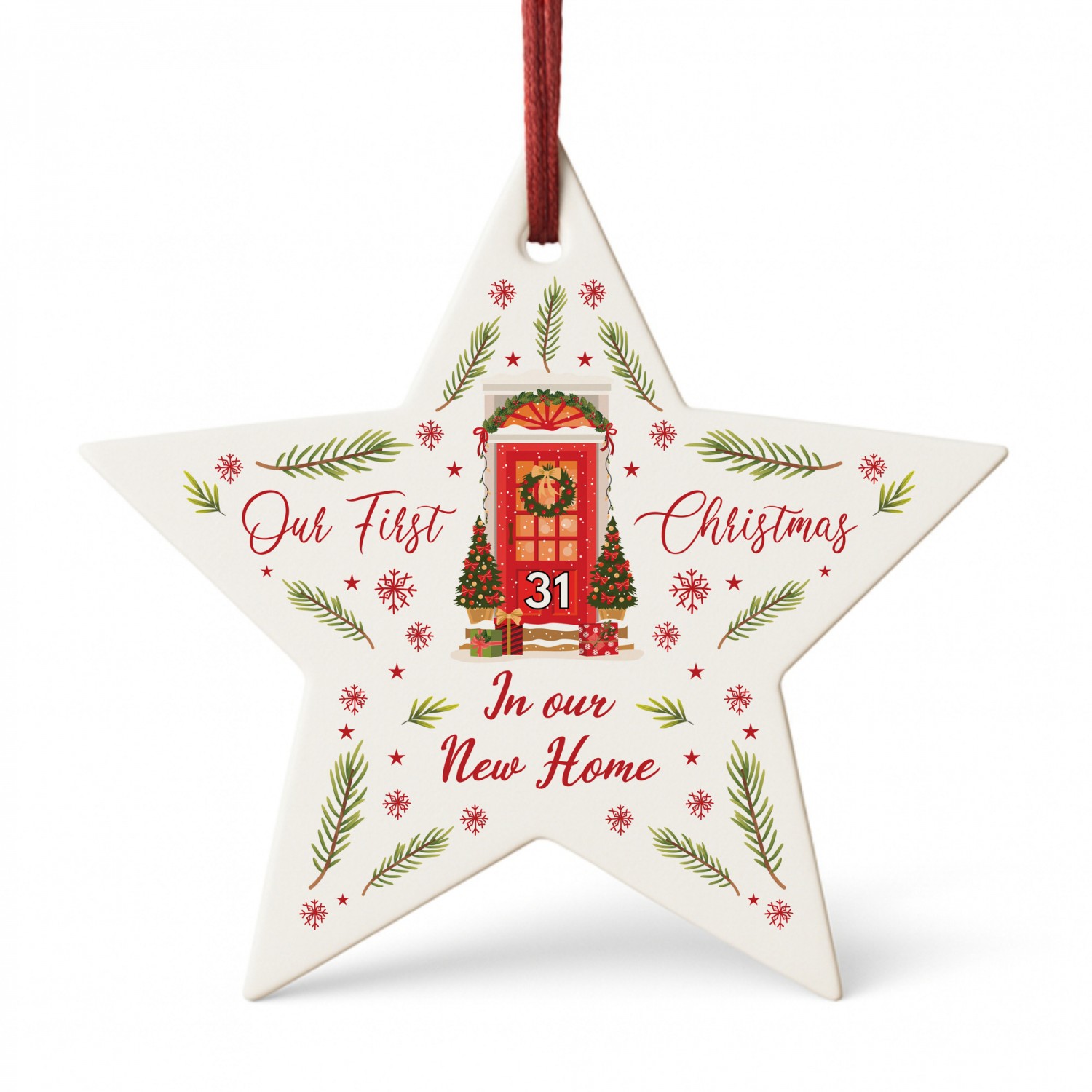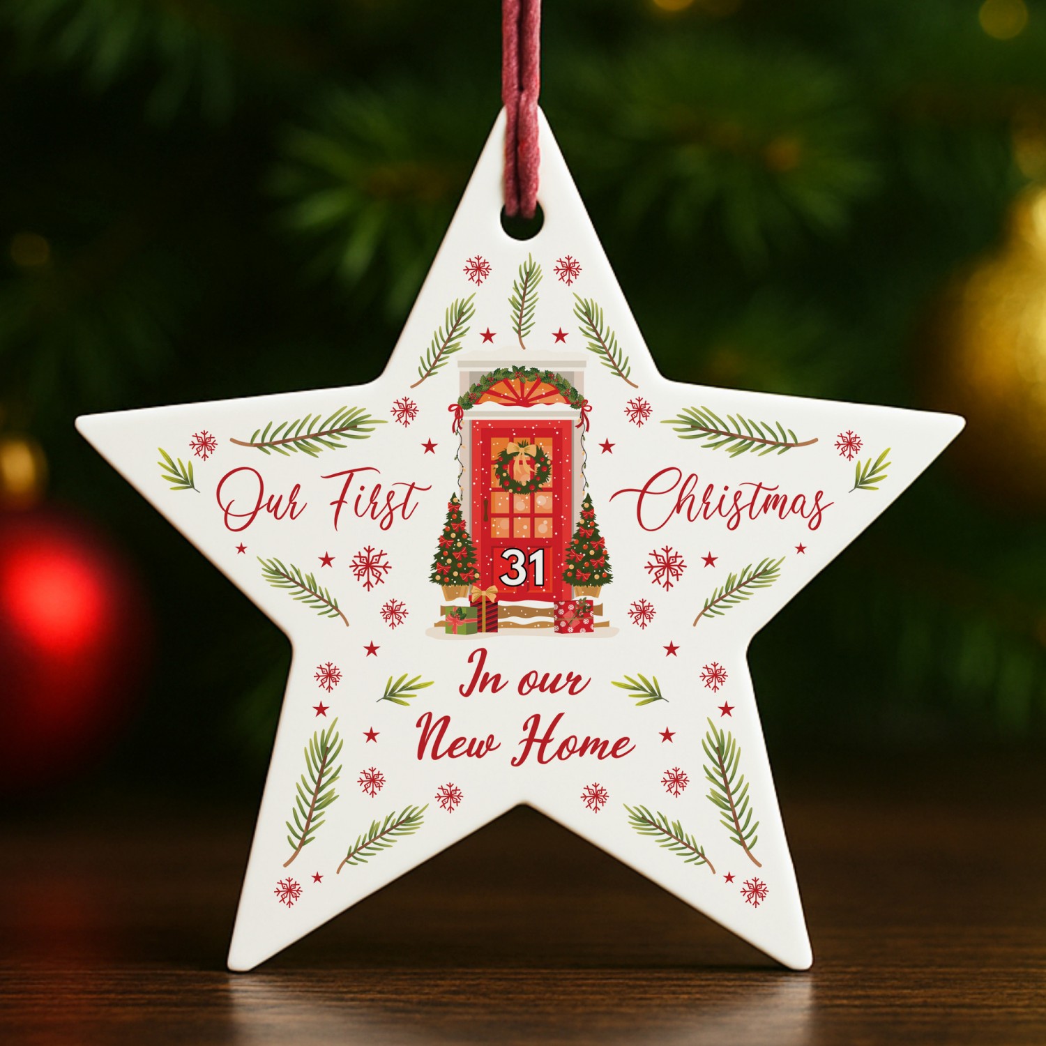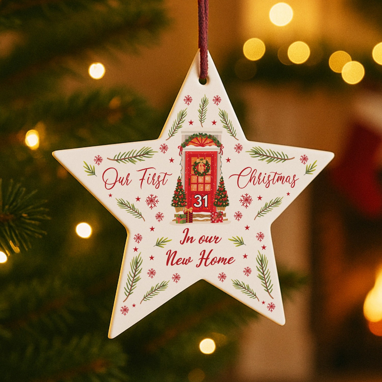 The charming design features seasonal illustrations of a front door, trees, stars and holly, paired with the words 'Our First Christmas In Our New Home' and your chosen door number, making it a truly special keepsake to mark this milestone. Perfect as a thoughtful housewarming gift, a Christmas decoration for couples, or a lasting reminder of your first festive season in a new place, this ornament captures the joy of new beginnings.
