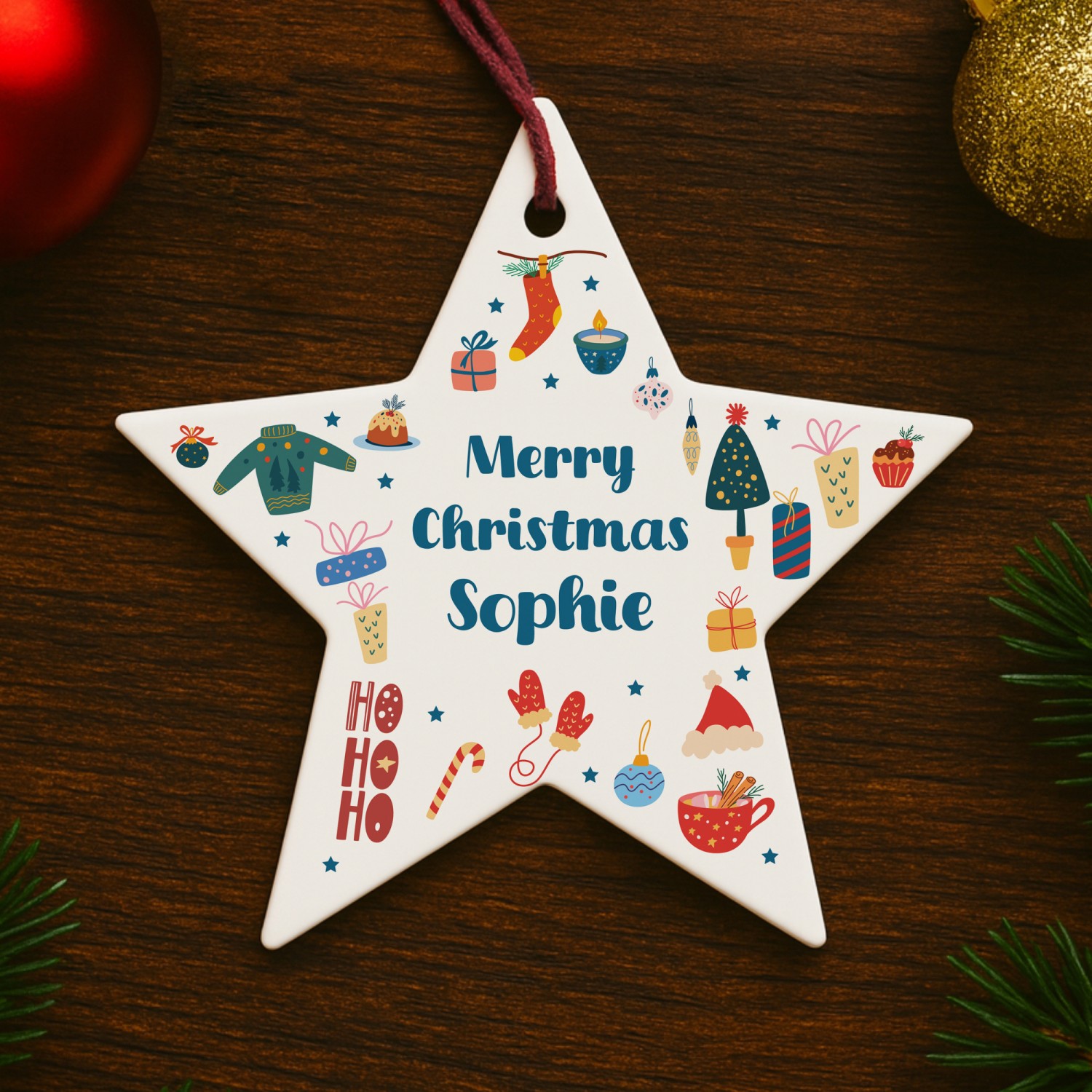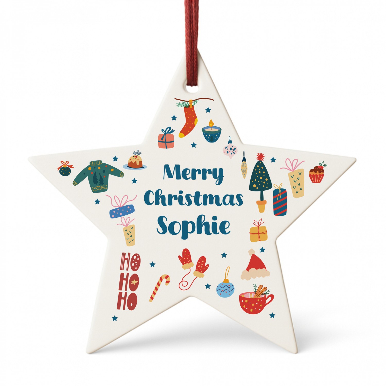 The delightful design features classic festive illustrations, including gingerbread men, candy canes, holly sprigs, stars and baubles, framing your own chosen text at the centre. You can customise it with a family name, a heartfelt message, a festive greeting, or even a memorable date, making this decoration perfect for any occasion during the holiday season.