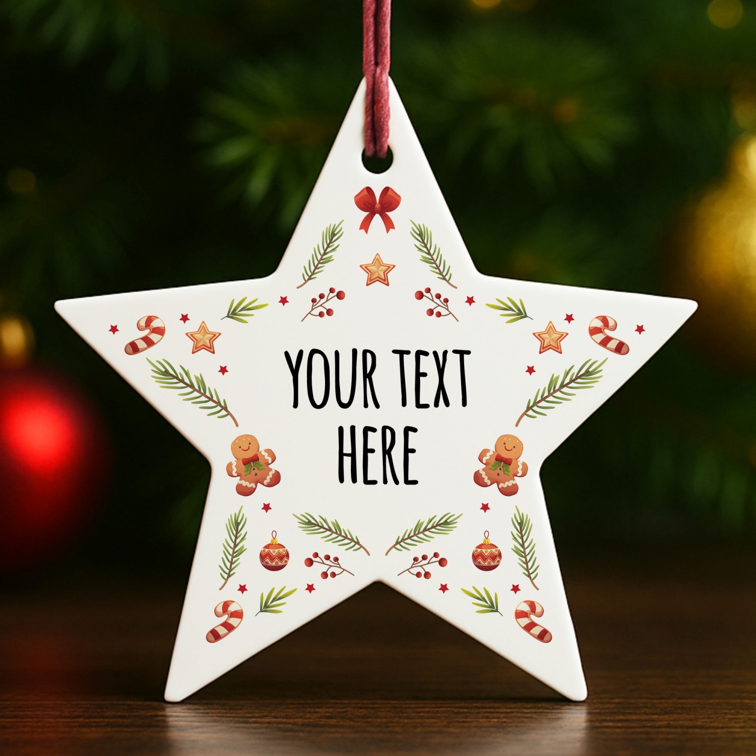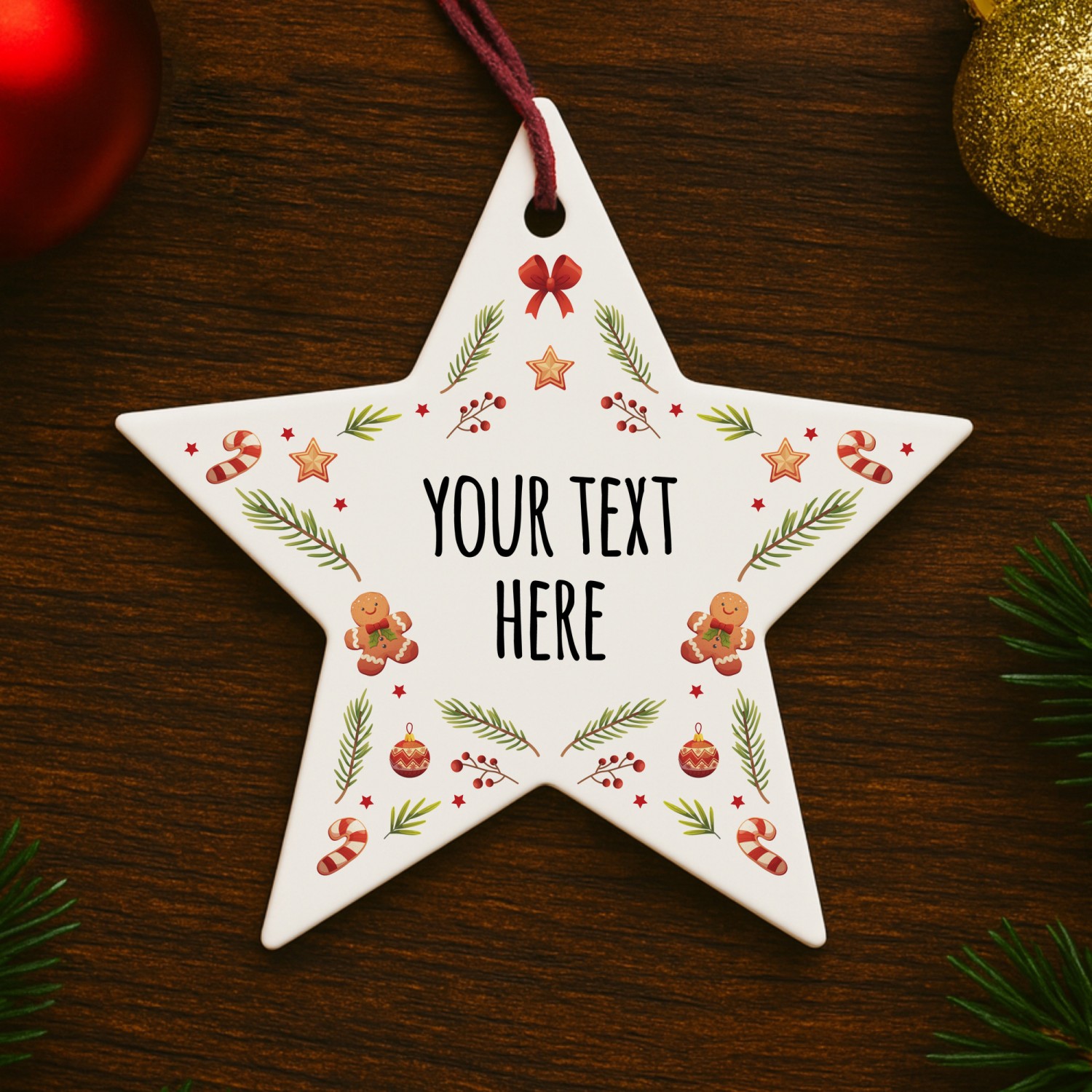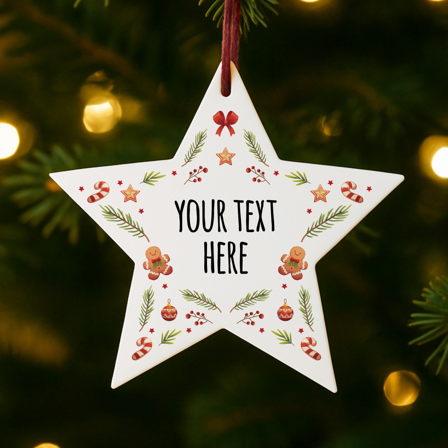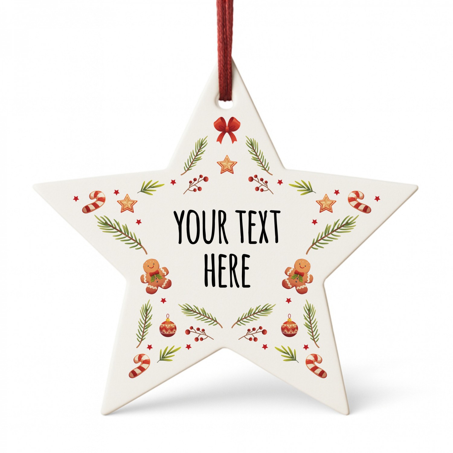 The delightful design features classic festive illustrations, including gingerbread men, candy canes, holly sprigs, stars and baubles, framing your own chosen text at the centre. You can customise it with a family name, a heartfelt message, a festive greeting, or even a memorable date, making this decoration perfect for any occasion during the holiday season.