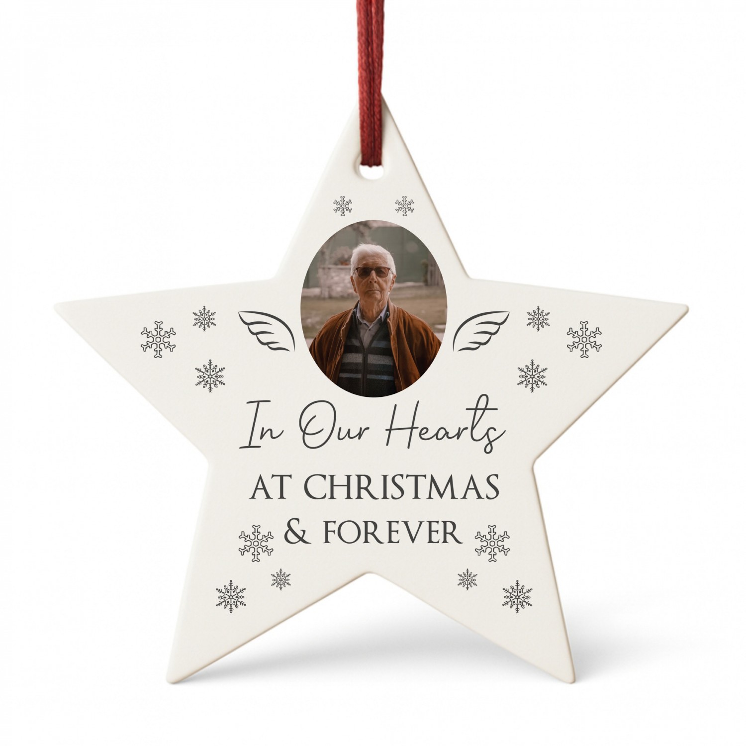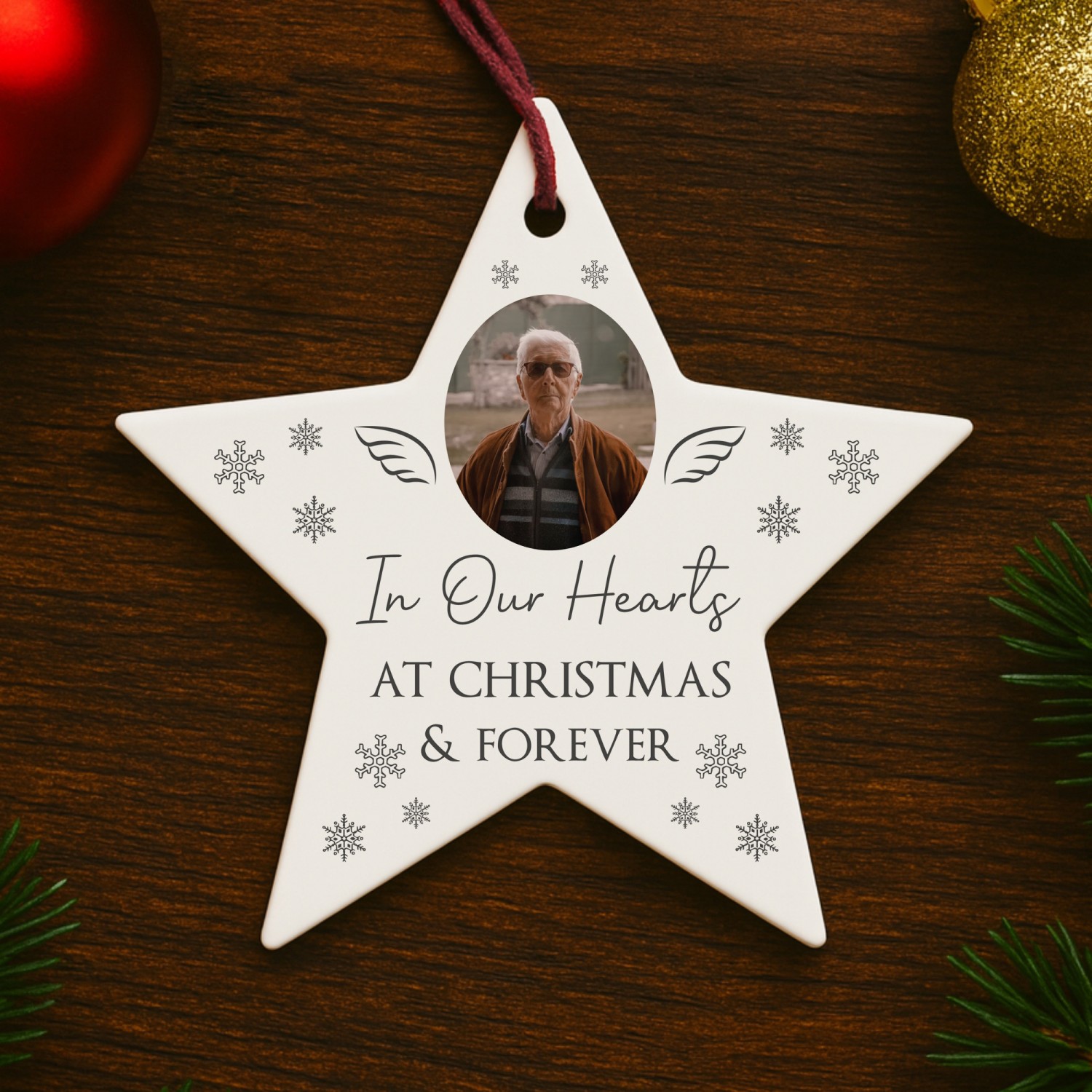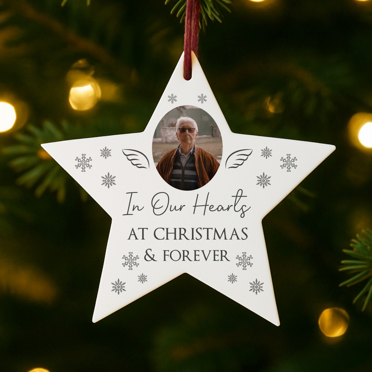 The decoration features a photo space at the centre, framed by delicate angel wings and surrounded by snowflakes, with the heartfelt message 'In Our Hearts At Christmas & Forever'. This thoughtful design serves as a touching tribute, allowing you to keep a loved one's memory close during the festive season and beyond.