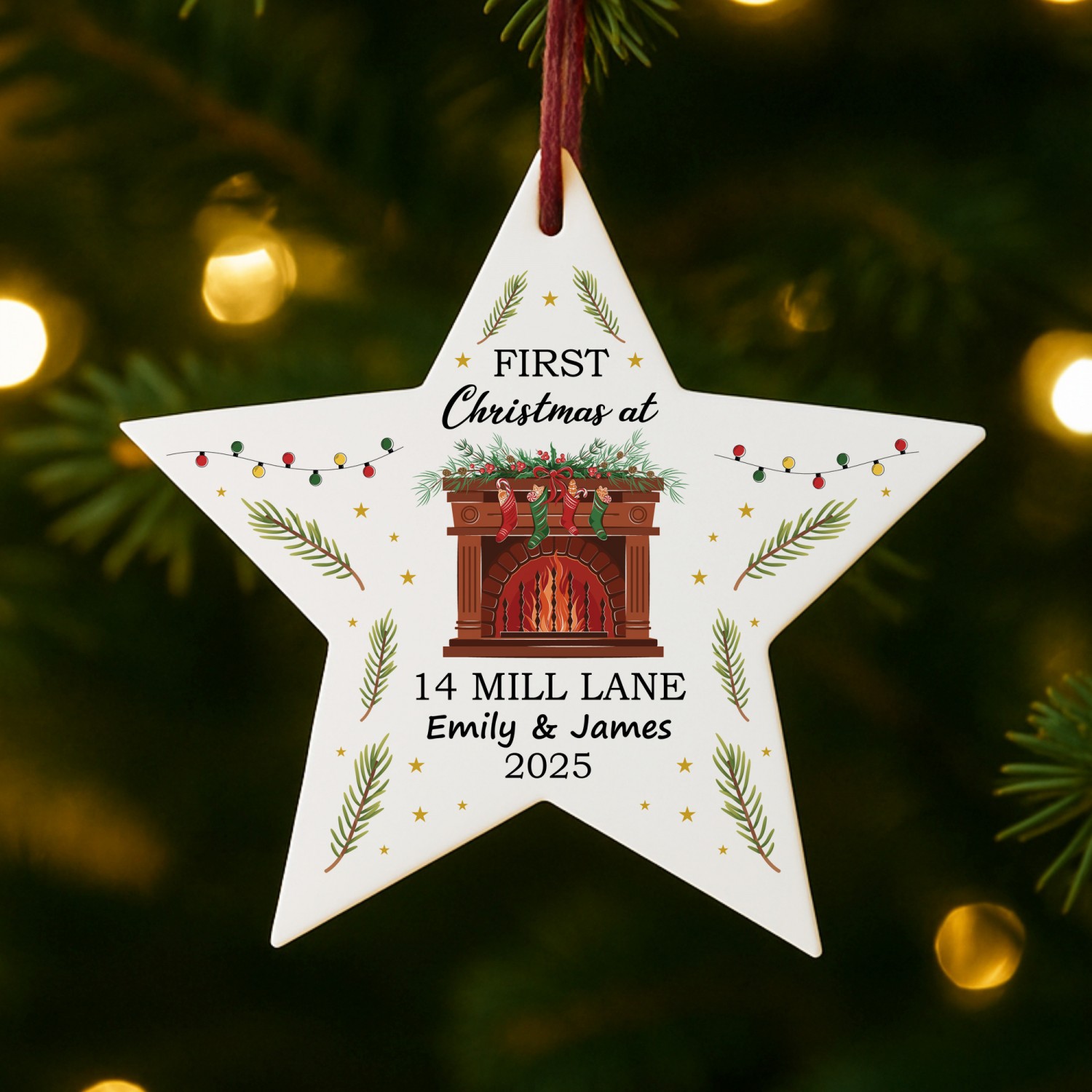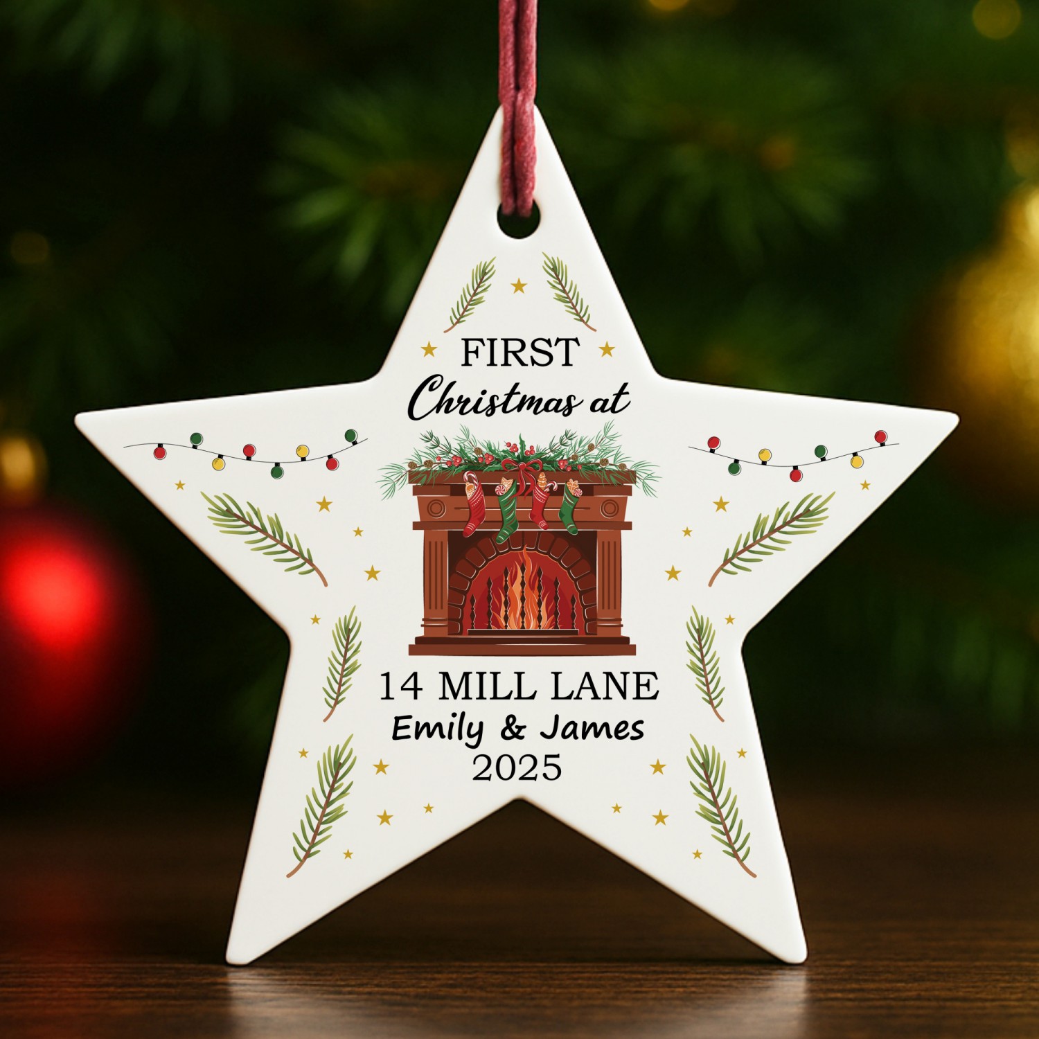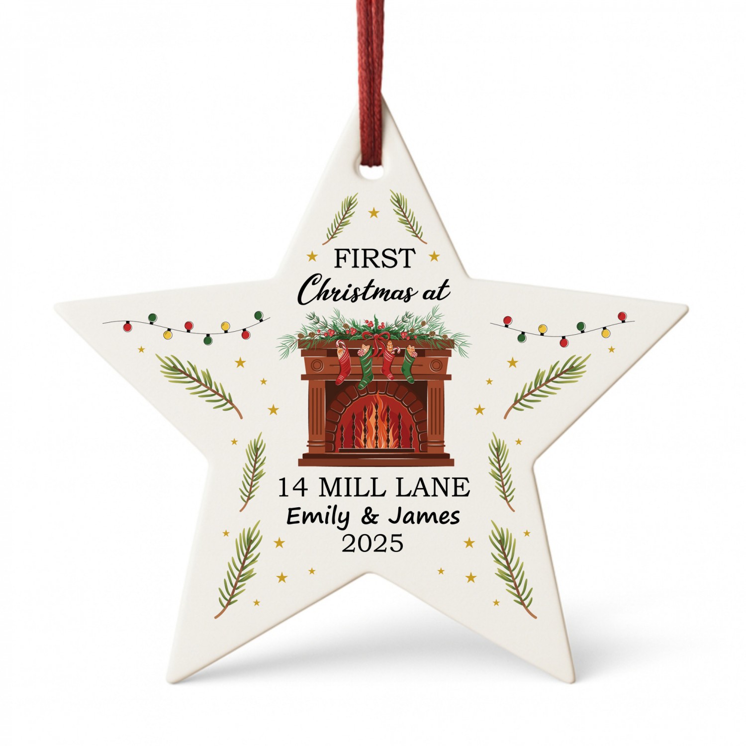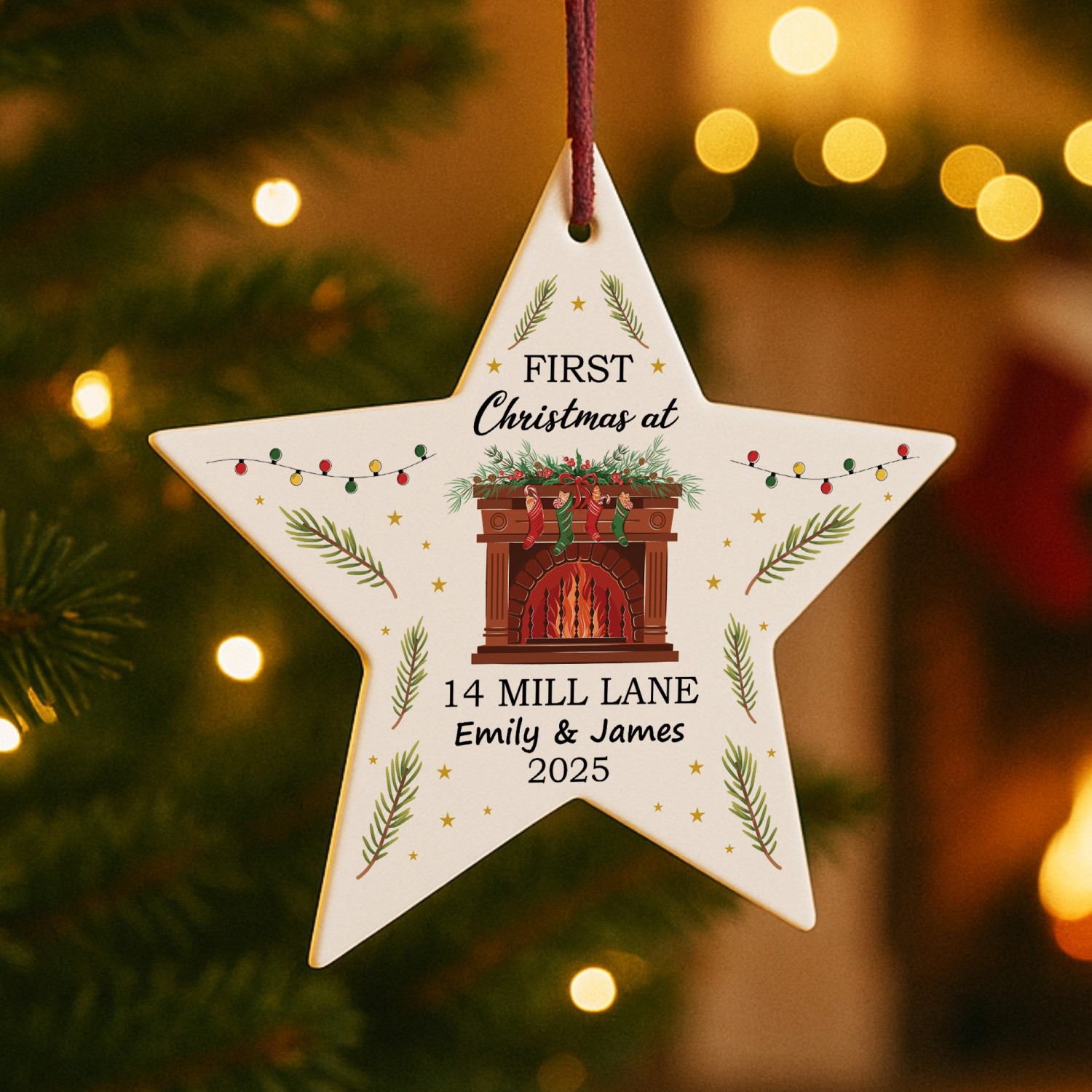 The charming design features seasonal illustrations of a front door, trees, stars and holly, paired with the words 'First Christmas At' and your chosen year, names and address, making it a truly special keepsake to mark this milestone. Perfect as a thoughtful housewarming gift, a Christmas decoration for couples, or a lasting reminder of your first festive season in a new place, this ornament captures the joy of new beginnings.