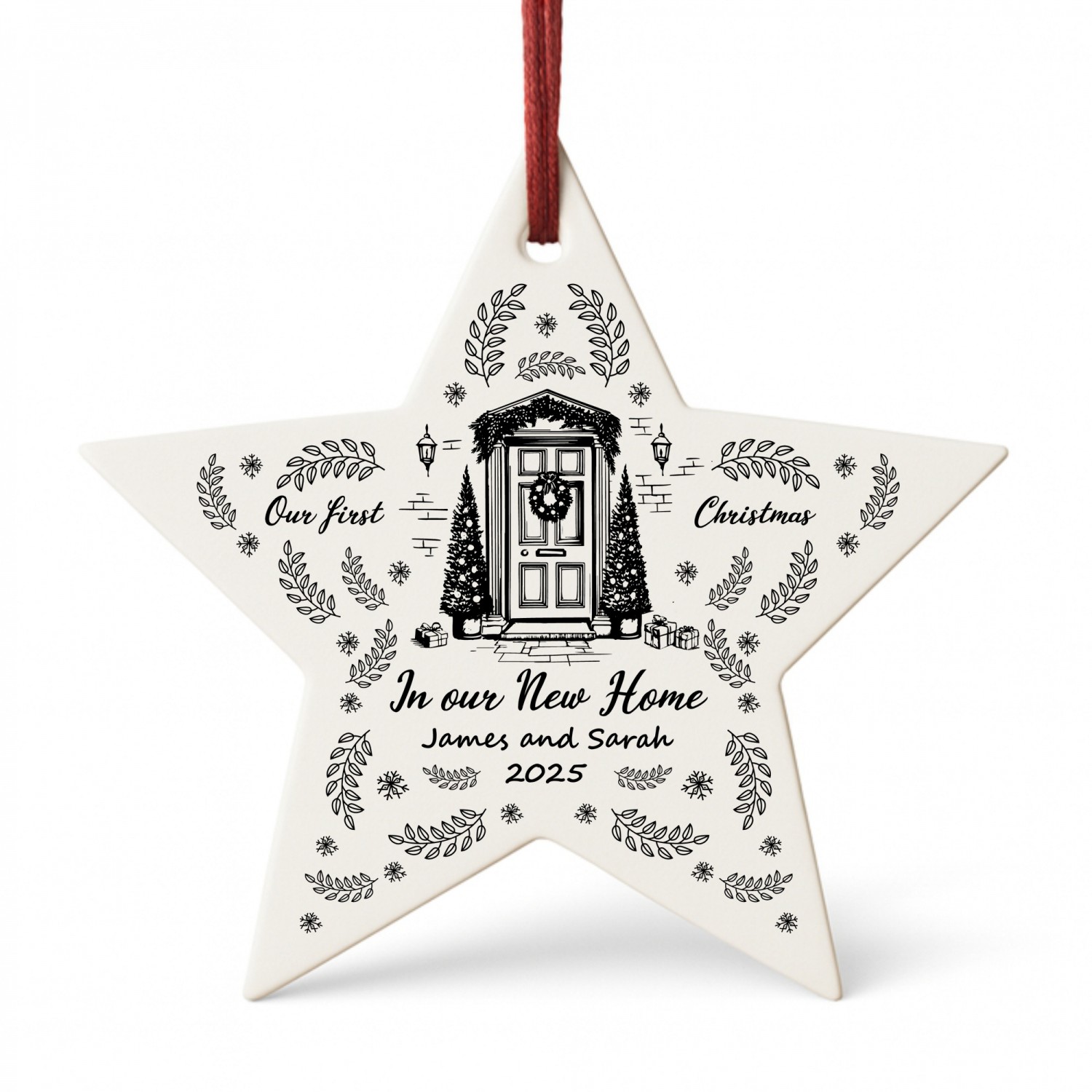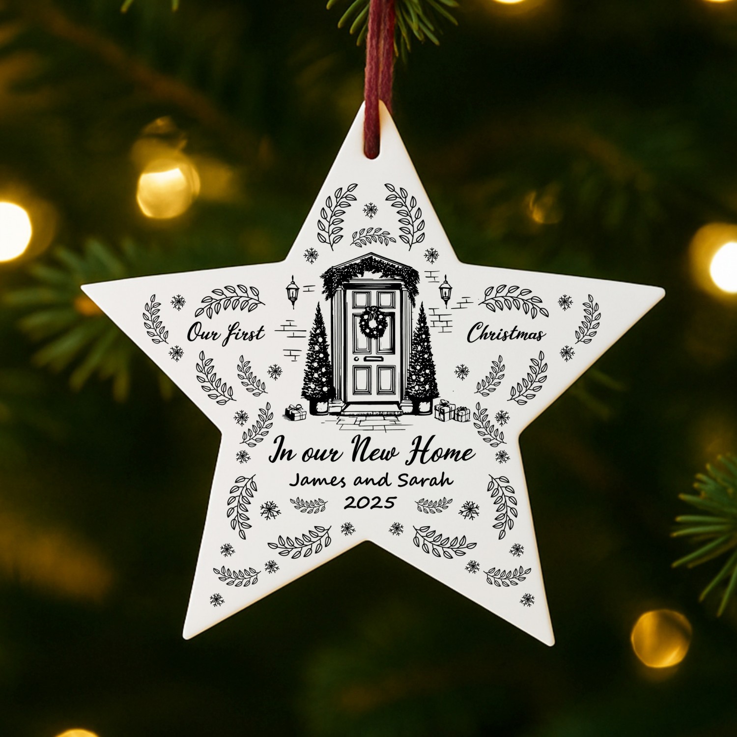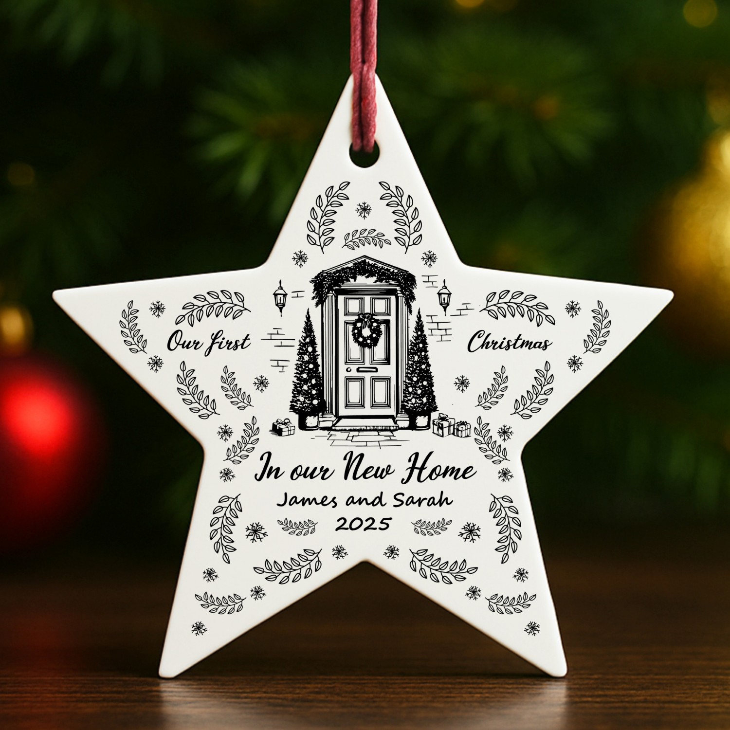 The charming design features seasonal illustrations of a front door, trees, stars and holly, paired with the words 'Our First Christmas In Our New Home' and your chosen year and names, making it a truly special keepsake to mark this milestone. Perfect as a thoughtful housewarming gift, a Christmas decoration for couples, or a lasting reminder of your first festive season in a new place, this ornament captures the joy of new beginnings.