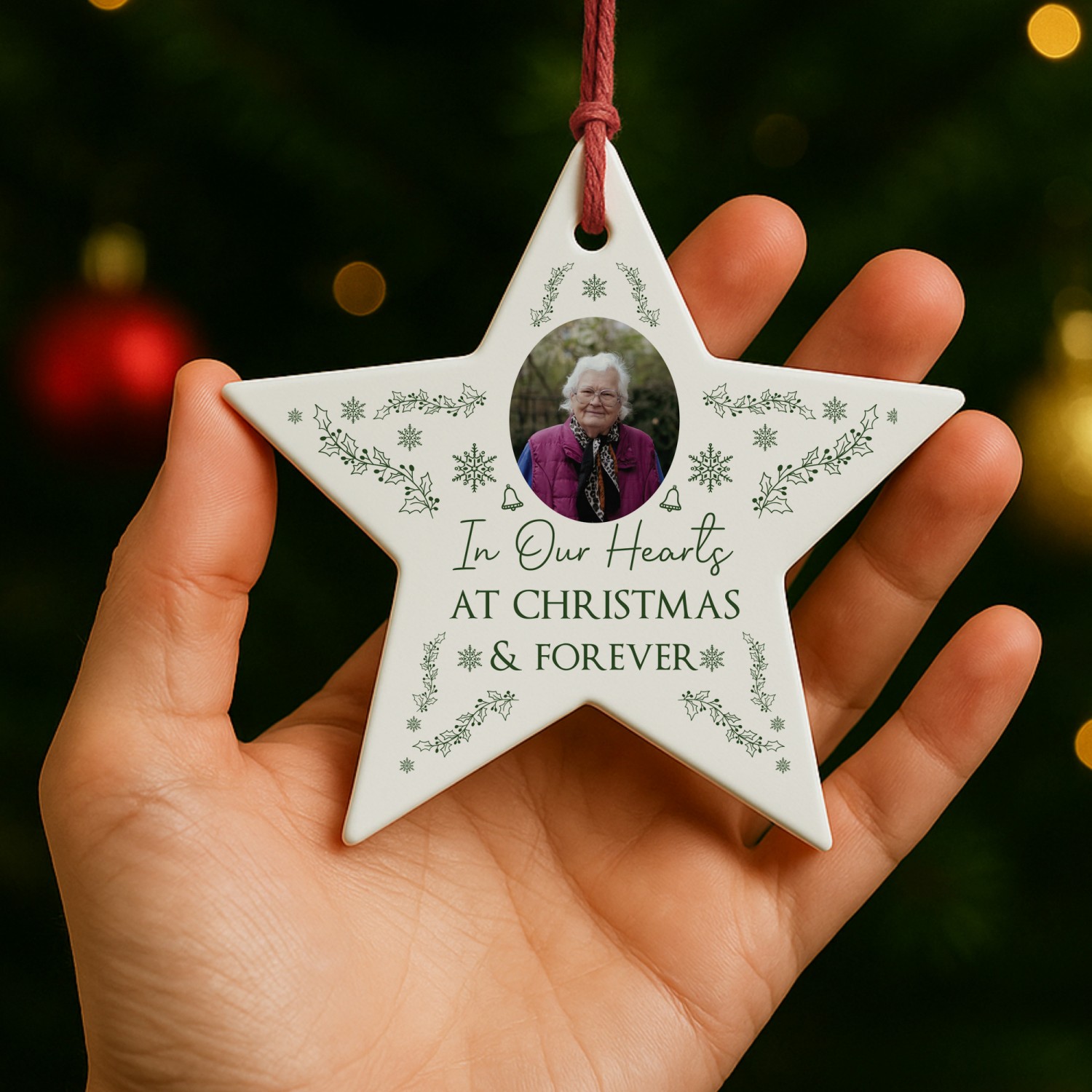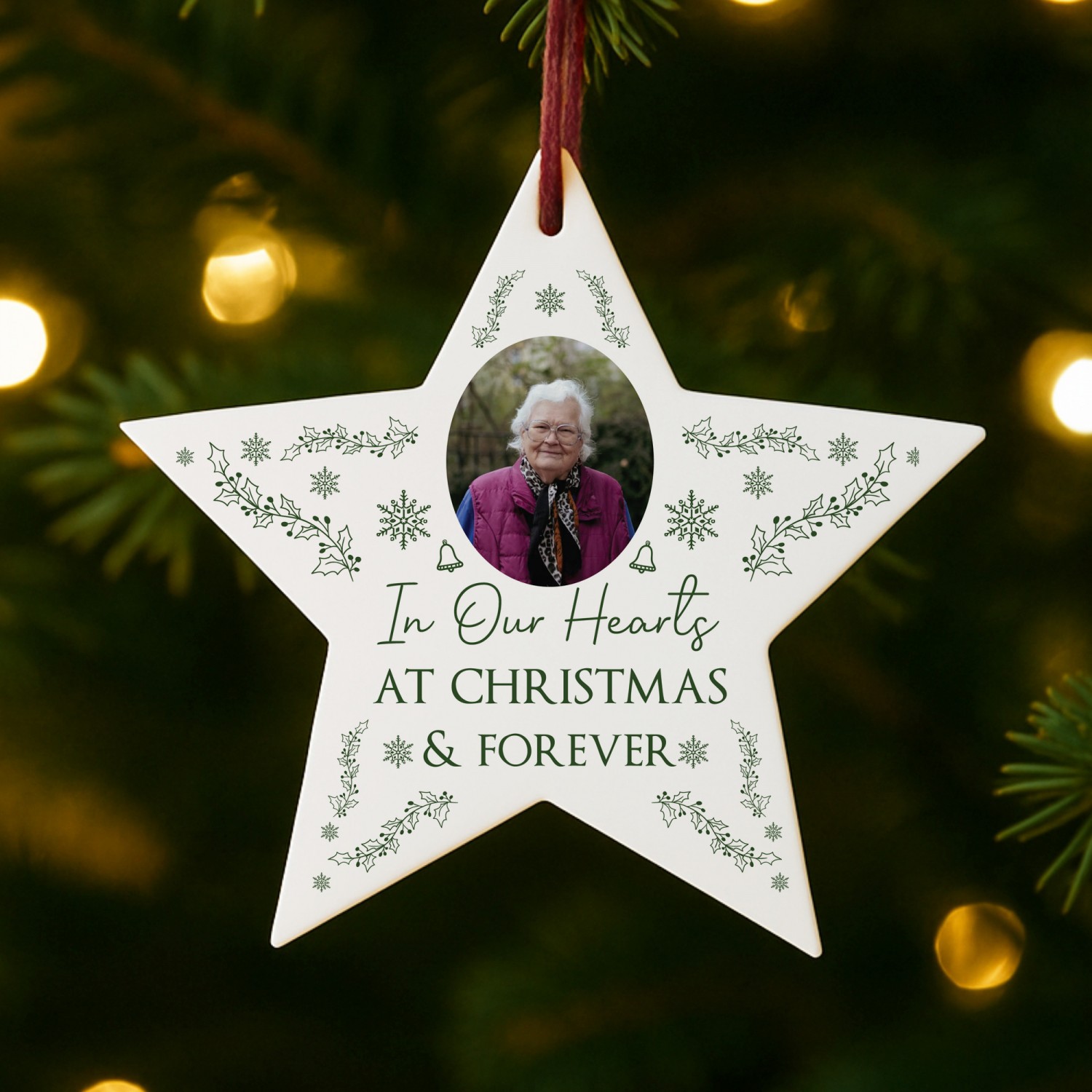 The decoration features a photo space at the centre, framed by delicate angel wings and surrounded by snowflakes, with the heartfelt message 'In Our Hearts At Christmas & Forever'. This thoughtful design serves as a touching tribute, allowing you to keep a loved one's memory close during the festive season and beyond.