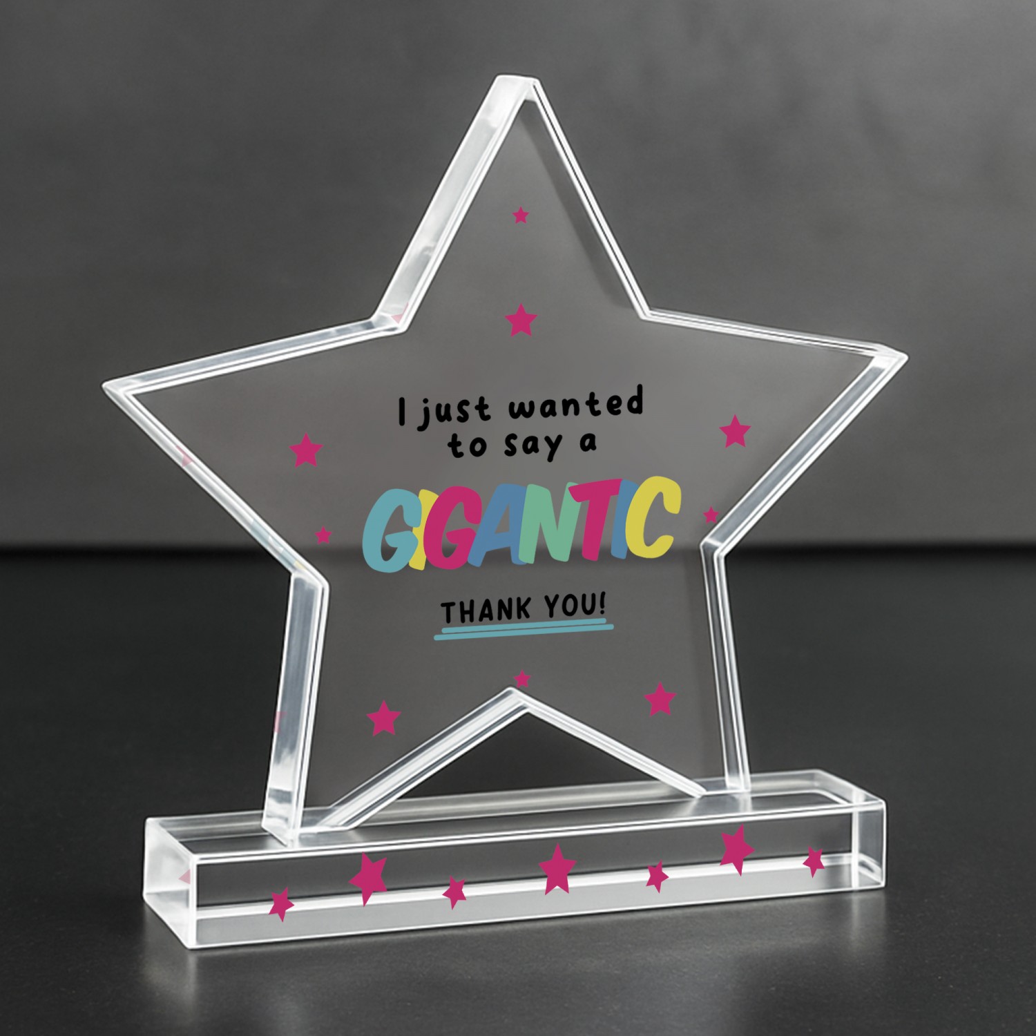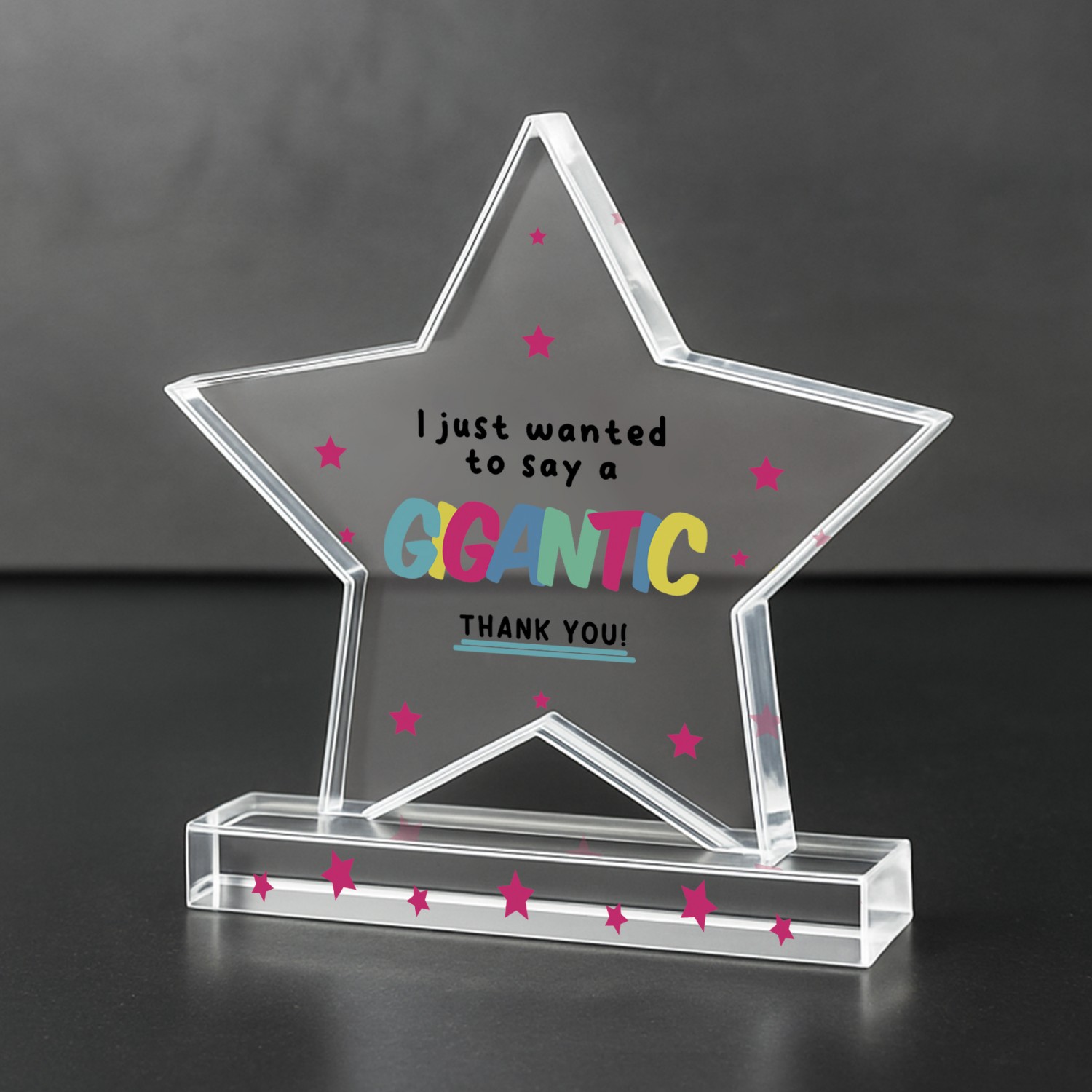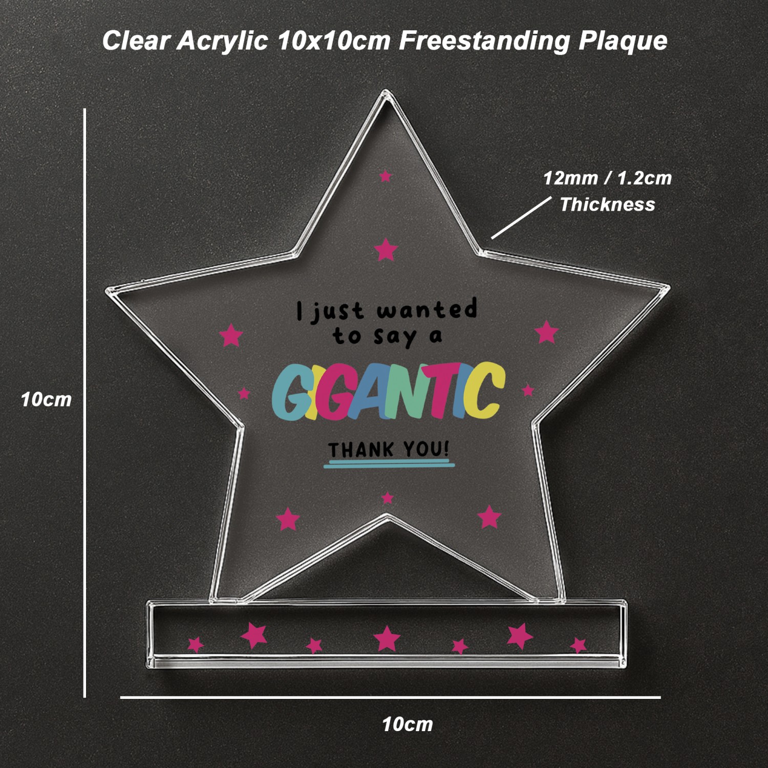 Celebrate someone special with this elegant freestanding acrylic star plaque, a heartfelt way to say thank you and recognise the joy, support and accomplishments they've brought to your life. Expertly crafted from premium, crystal-clear acrylic, this 10cm by 10cm plaque stands proudly on its own thanks to a solid rectangular base, making it a charming addition to any home or office space.