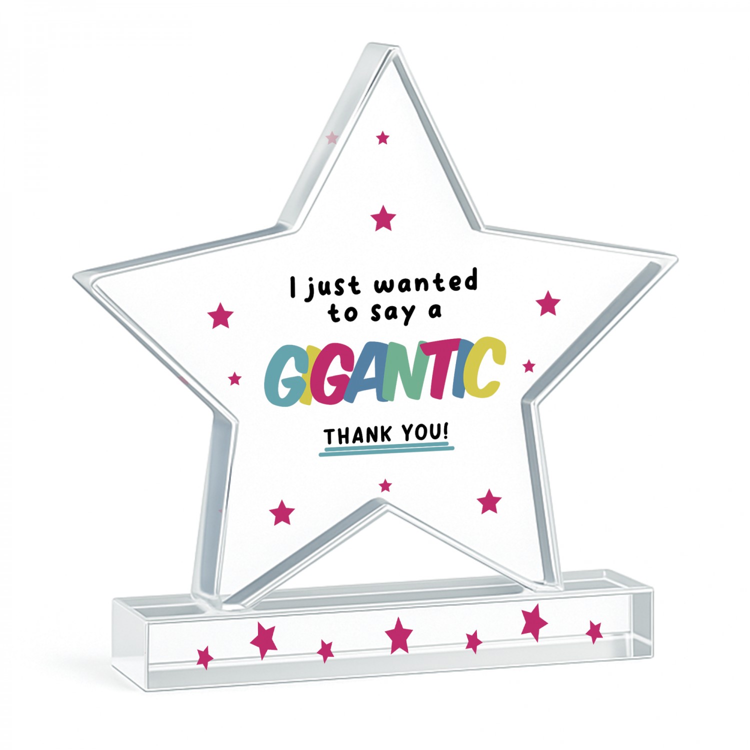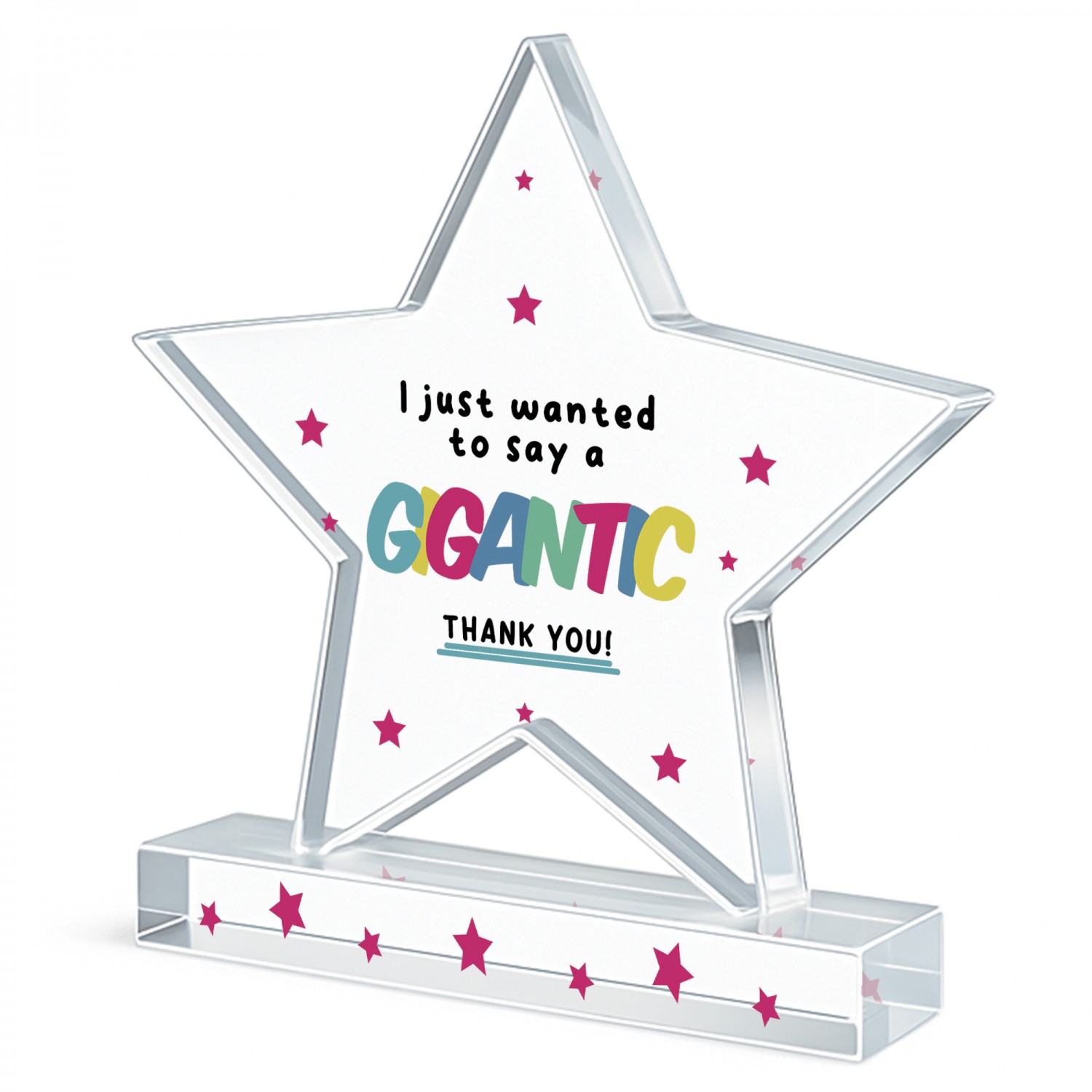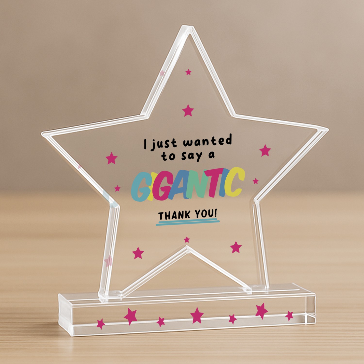 Celebrate someone special with this elegant freestanding acrylic star plaque, a heartfelt way to say thank you and recognise the joy, support and accomplishments they've brought to your life. Expertly crafted from premium, crystal-clear acrylic, this 10cm by 10cm plaque stands proudly on its own thanks to a solid rectangular base, making it a charming addition to any home or office space.