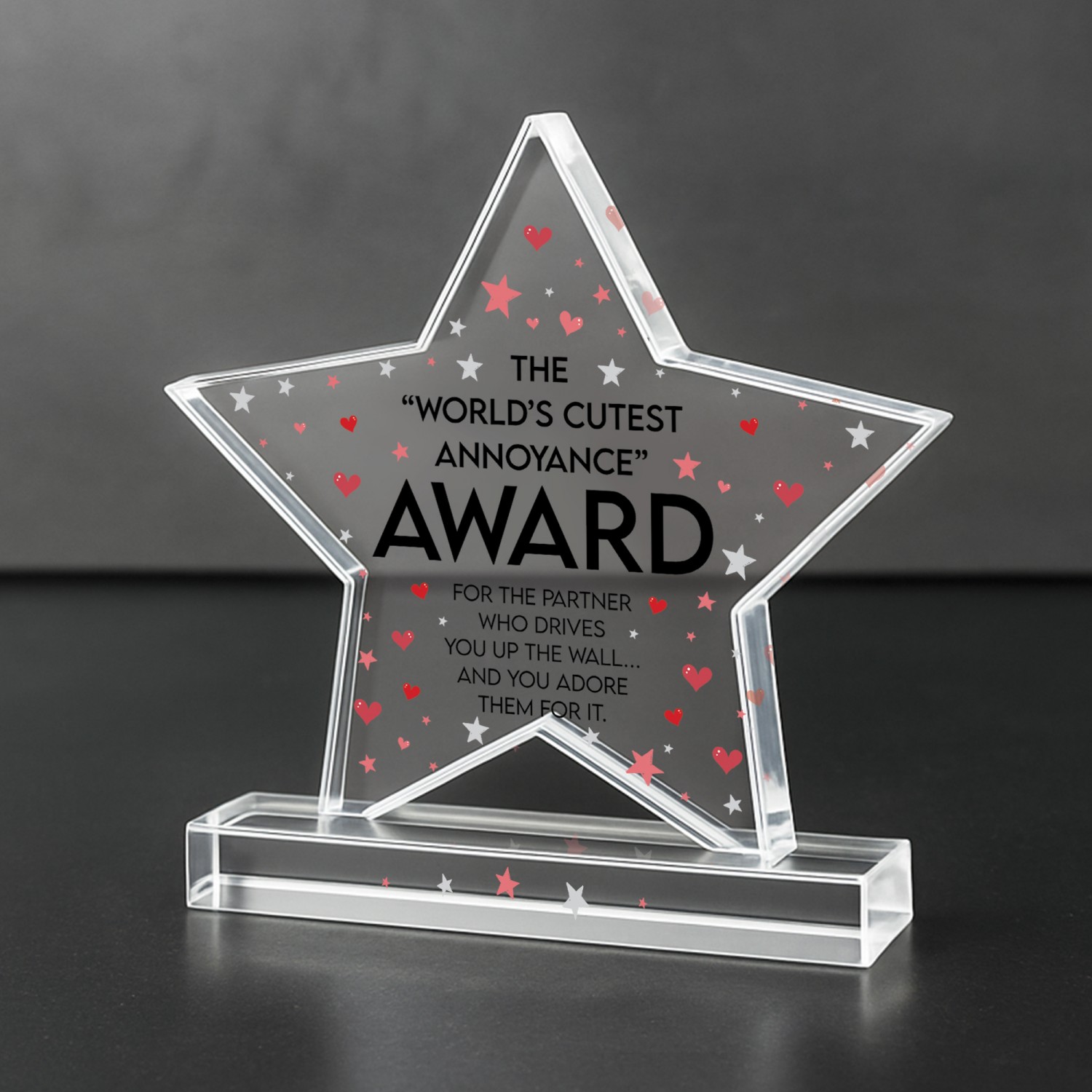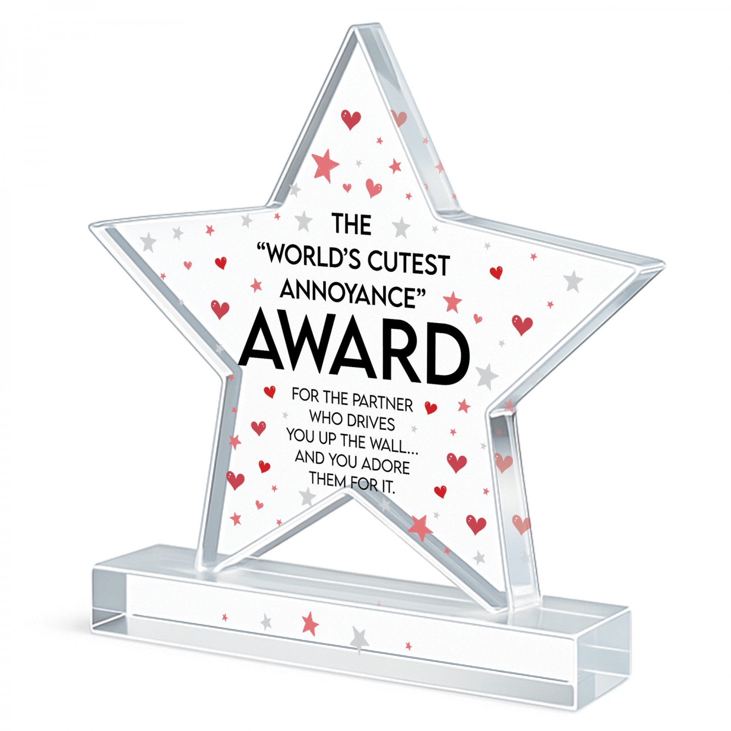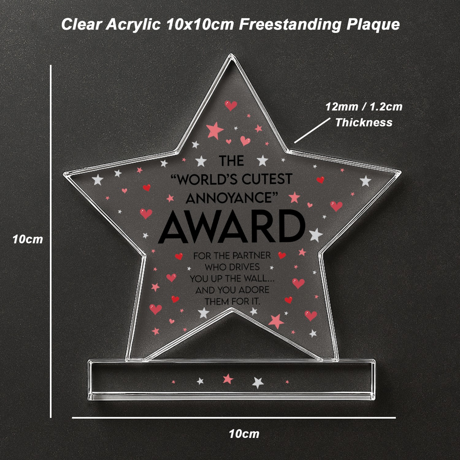 Celebrate your partner with this funny novelty acrylic award featuring the quote "World's Cutest Annoyance Award" on a premium freestanding keepsake. Designed as a charming and light hearted gift, this humorous trophy is perfect for boyfriends girlfriends husbands wives partners or couples who love giving thoughtful and playful presents. Made from high quality clear acrylic this freestanding award measures approximately 8 x 9 cm and is ideal for desks bedside tables shelves or display areas at home or work.