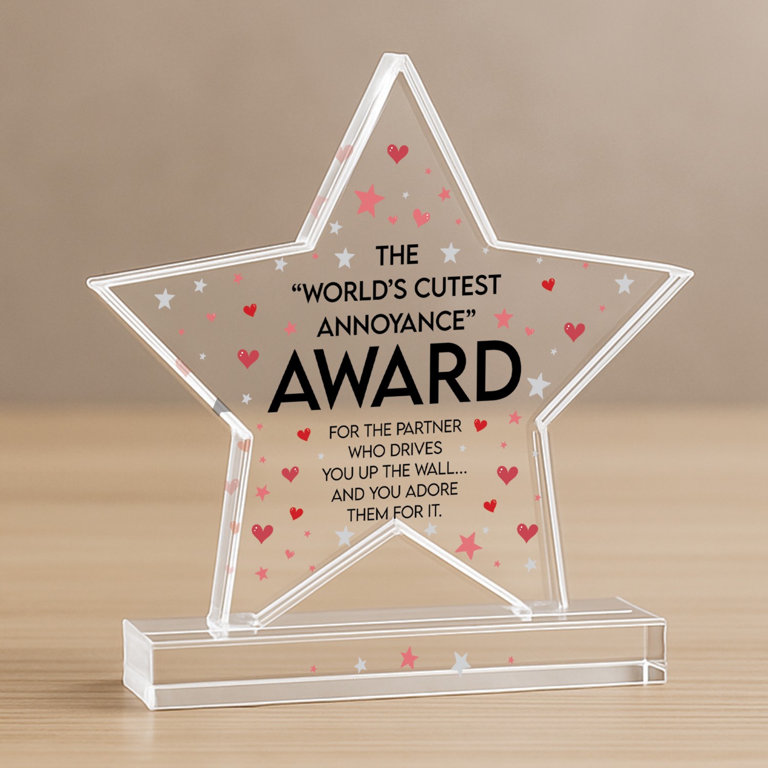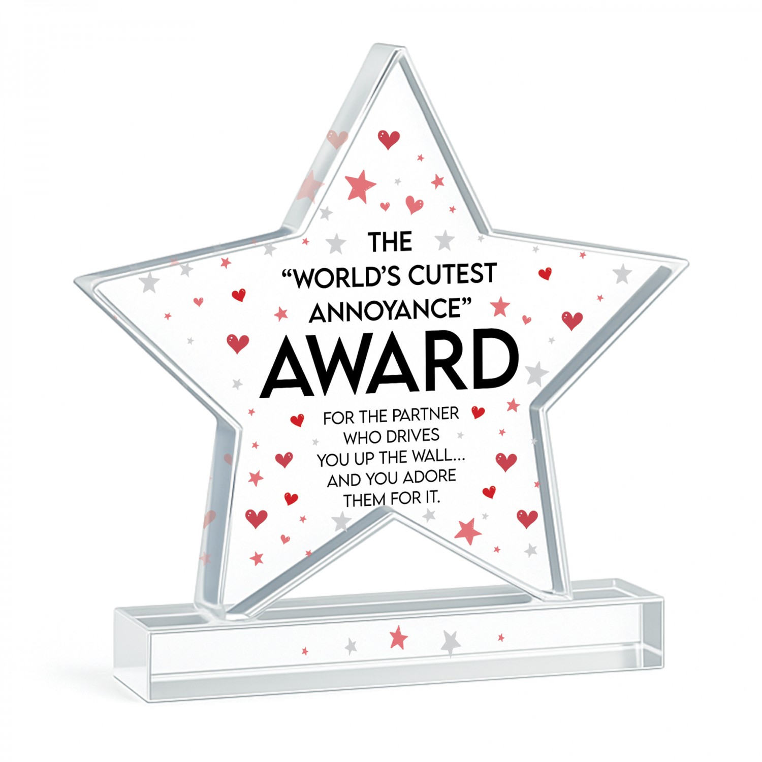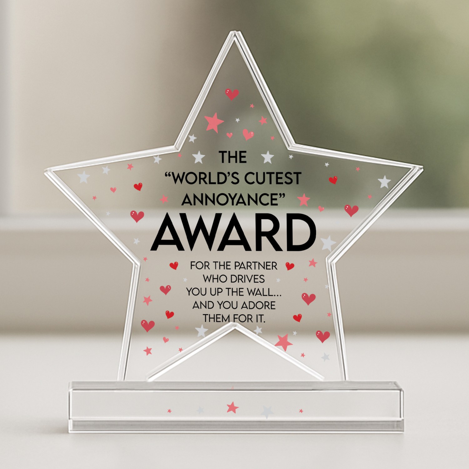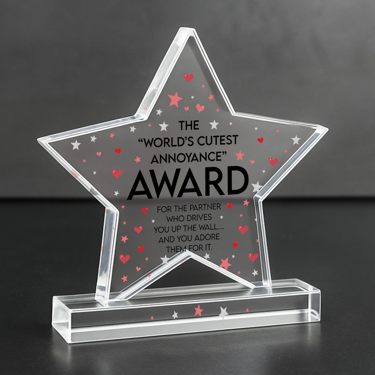 Celebrate your partner with this funny novelty acrylic award featuring the quote "World's Cutest Annoyance Award" on a premium freestanding keepsake. Designed as a charming and light hearted gift, this humorous trophy is perfect for boyfriends girlfriends husbands wives partners or couples who love giving thoughtful and playful presents. Made from high quality clear acrylic this freestanding award measures approximately 8 x 9 cm and is ideal for desks bedside tables shelves or display areas at home or work.