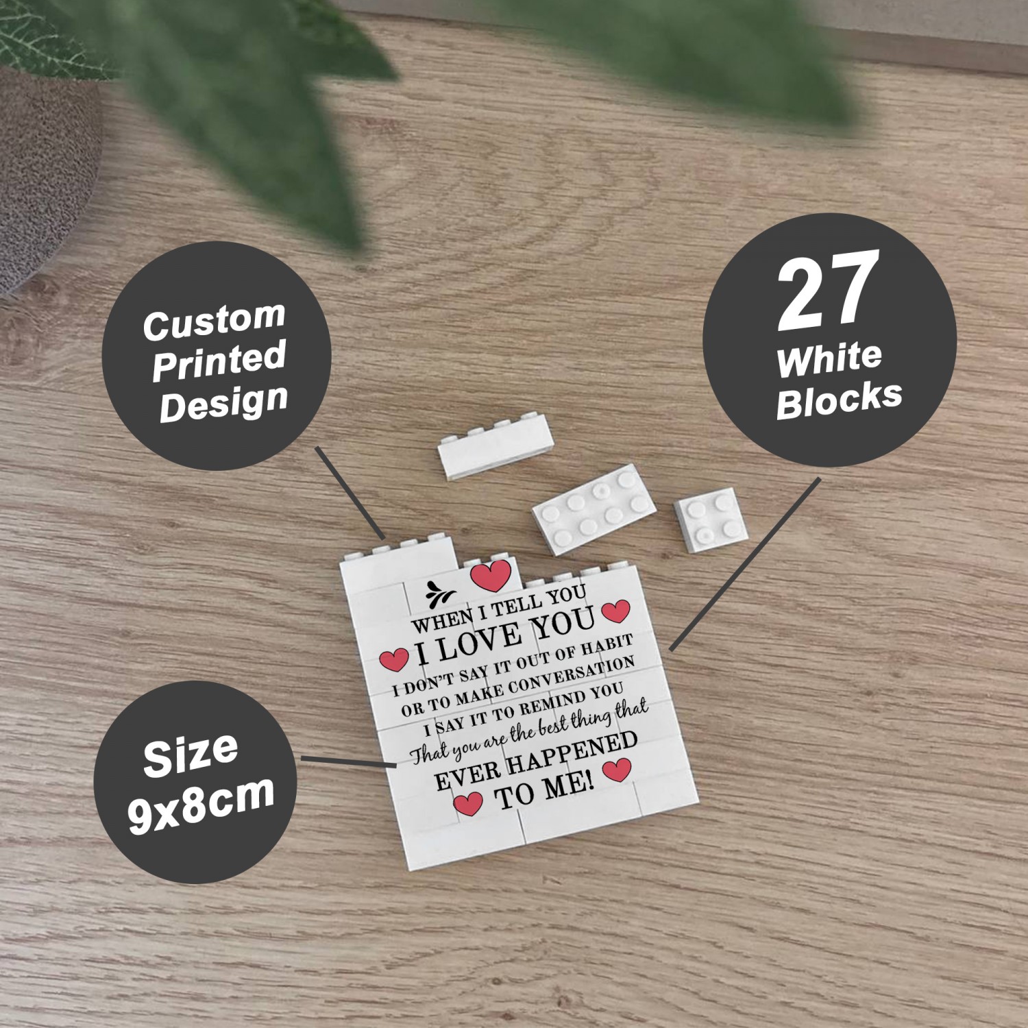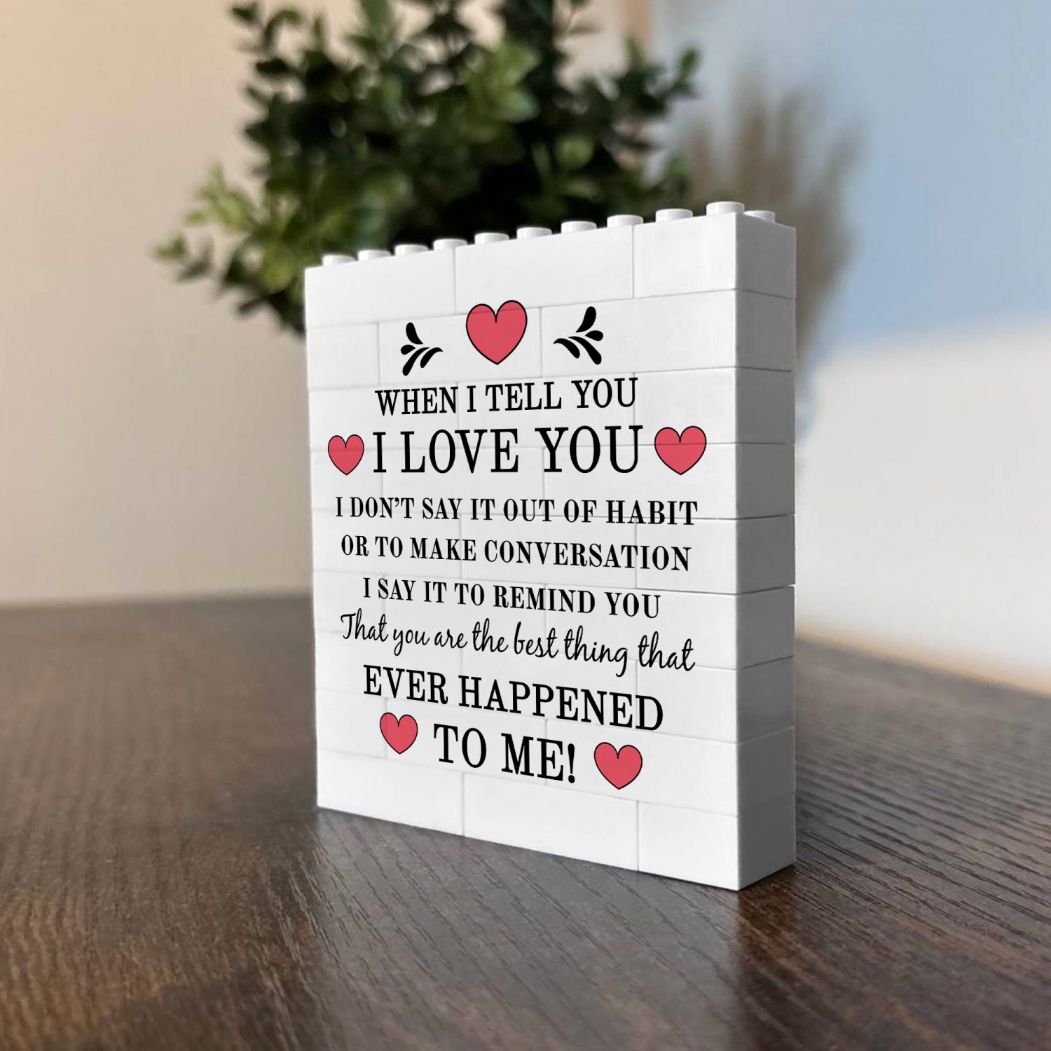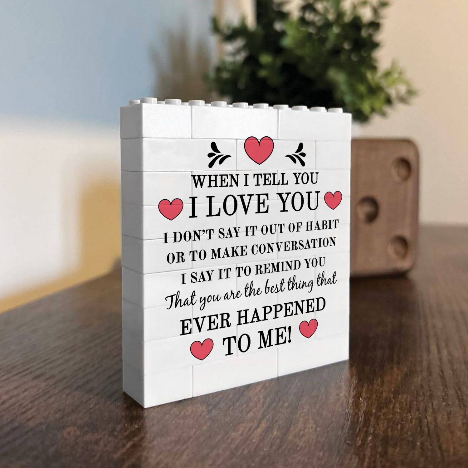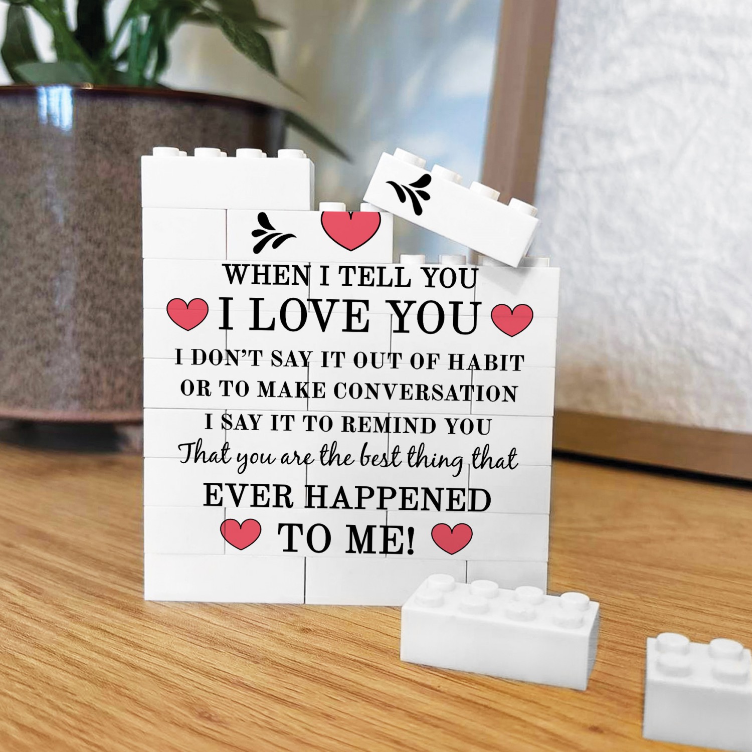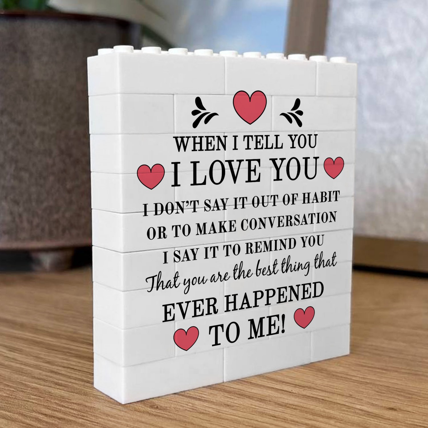 Whether you are looking for a romantic home decor piece, a novelty couples gift, or a unique Valentines keepsake, this white building block display offers a memorable alternative to traditional cards or framed prints.
